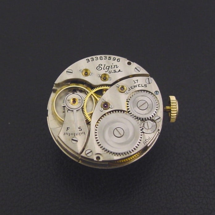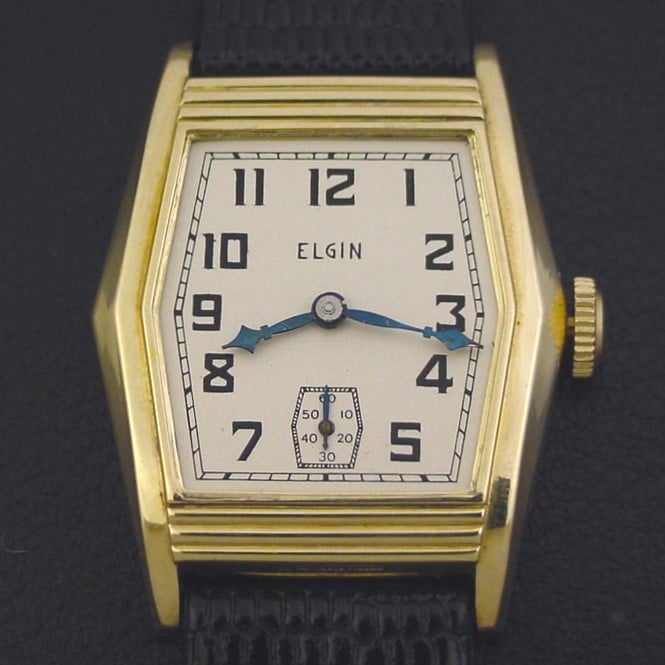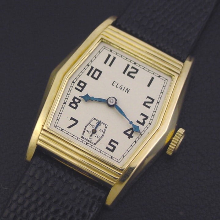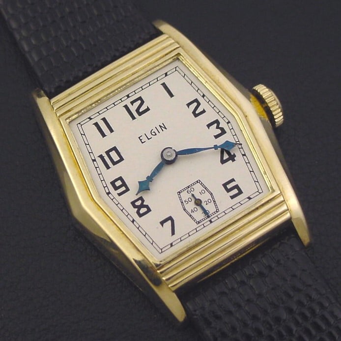 Scarce Elgin “Model 497” men’s Machine Age design wristwatch in 14K yellow gold fill, circa 1934.
