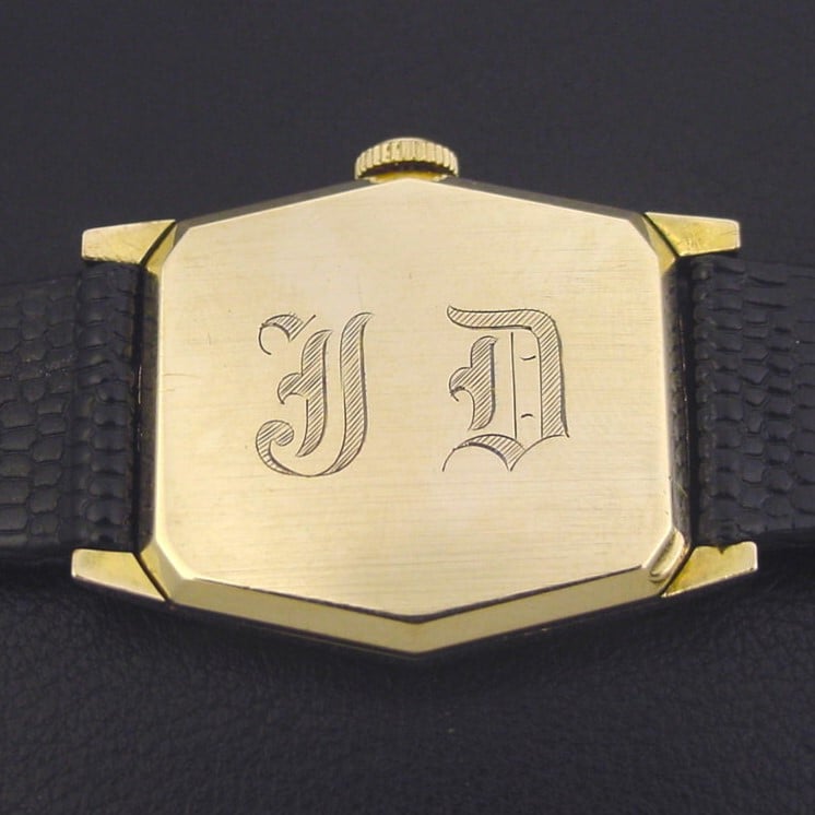 The "Model 497" has a sharply-angled Machine Age design 6-sided case with ribs above and below the dial. It was priced at $37.50 in 1934. It is a scarce model and this is only the second example I have ever offered. It is in crisp, near mint condition with no brassing. Caseback is superb, with a monogram. Case measures 38mm long and 30mm wide. Factory-original new-old-stock dial is superb. Has new glass crystal. Watch is powered by its correct 17-jewel Elgin grade 487 manual wind movement, just serviced and running strong.