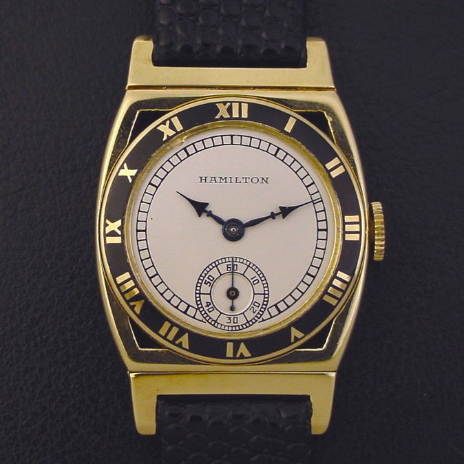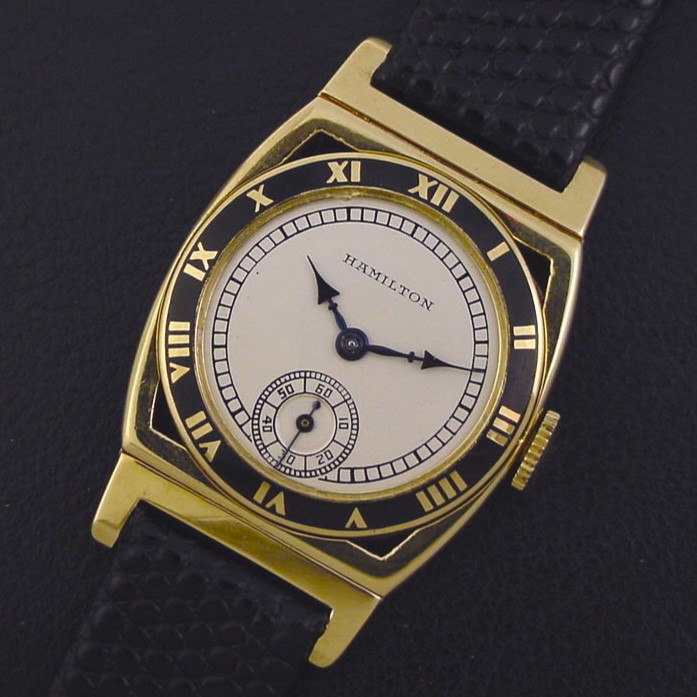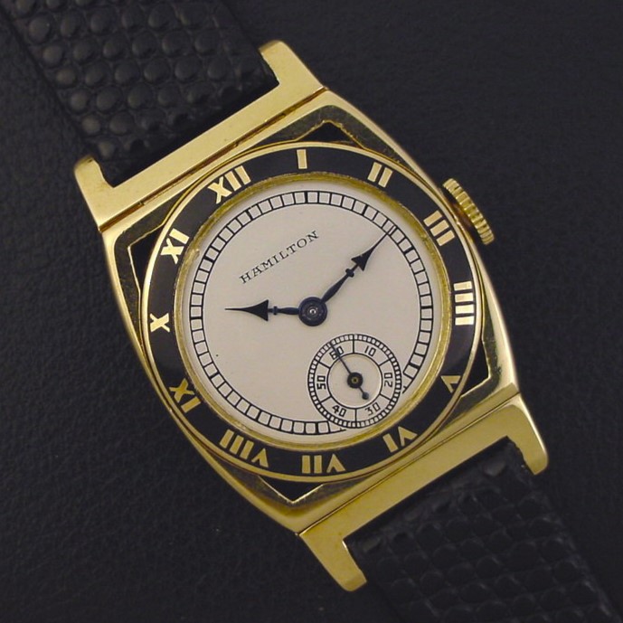 Very scarce Hamilton “Piping Rock” men’s Art Deco design wristwatch in solid 14K yellow gold with black enamel bezel, circa 1928.