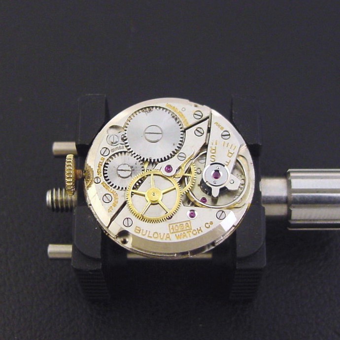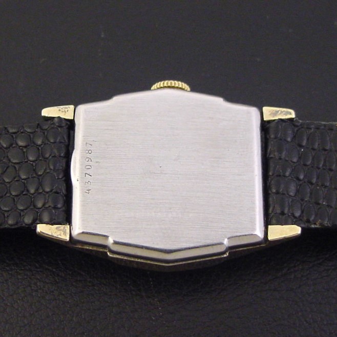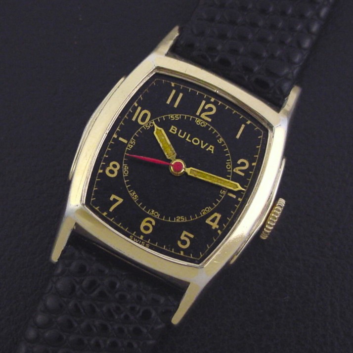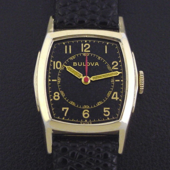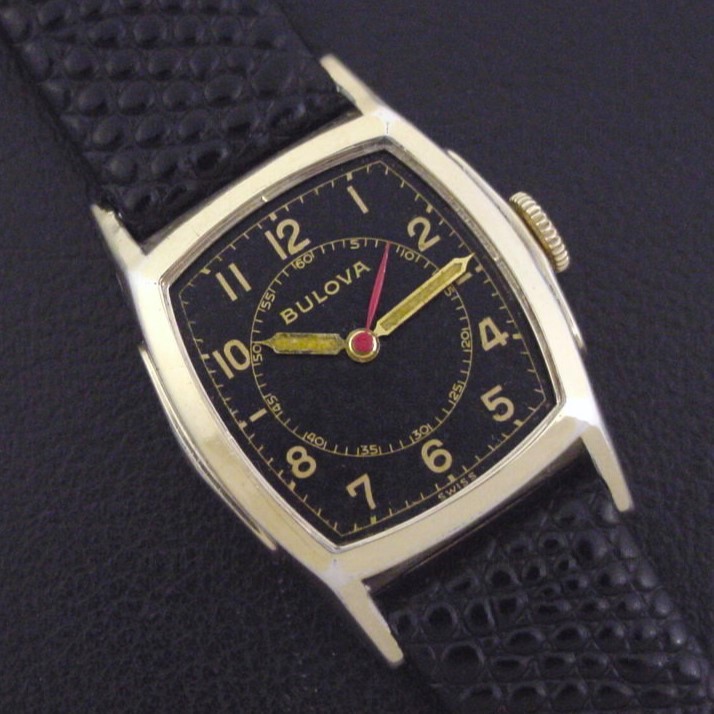 This smaller-sized men's watch has a sweep seconds hand and was aimed at medical personnel serving in the armed forces. This unusual variation has a black nickel finish dial with inlaid gilt numerals and tracks, and luminous-filled gold hands. It was priced at $37.50 in 1944. This example is in excellent condition with light brassing to the bezel corners and lugs. Caseback is excellent and unengraved. The case measures 35mm long and 26mm wide. Has new glass crystal. Original dial is excellent. The watch is powered by its correct 17-jewel Bulova grade 10BA manual wind movement, just serviced and running strong.