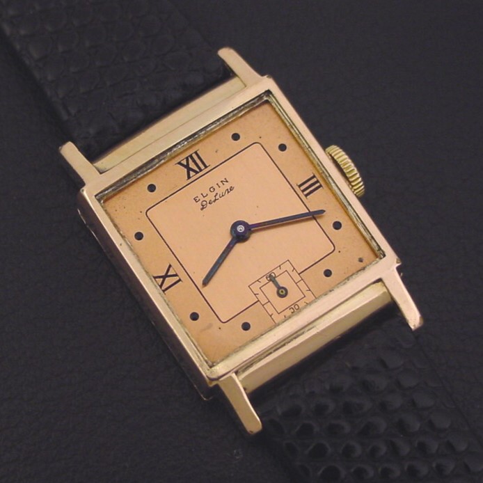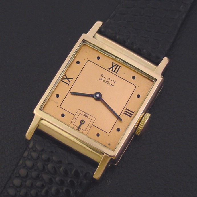 Scarce Elgin "DeLuxe 5510" men's Art Deco design wristwatch in 10K rose gold fill, circa 1942.