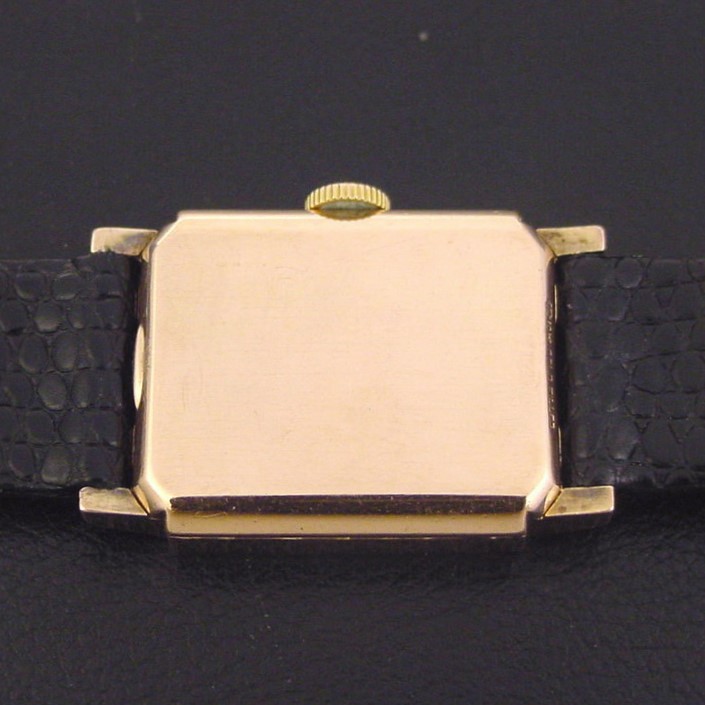 The "DeLuxe 5510" is a smaller-sized men's model and is fairly scarce in rose. It was only offered in the 1942 catalog, priced at $50.00. It is in excellent condition with only a few specks of brassing to the tips of the lugs. Caseback is excellent and unengraved. Case measures 34mm long and 23mm long. Refinished two-tone dial is superb. Has new glass crystal. The watch is powered by its correct 17-jewel Elgin grade 558 manual wind movement, just serviced and running strong.