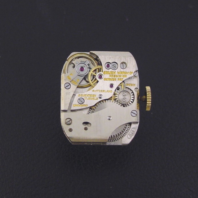 The "Heritage" was one of the final Curvex models introduced by Gruen. It has an hour-glass shaped case with stylized hour-glass embossed markers on the dial. This example is in excellent condition with no brassing. Caseback is excellent and unengraved. Case measures 42mm long and 25mm wide. Has new glass crystal. Original white-finish dial is excellent. The watch is powered by its correct 17-jewel Gruen grade 370 Curvex manual movement, just serviced and running strong.