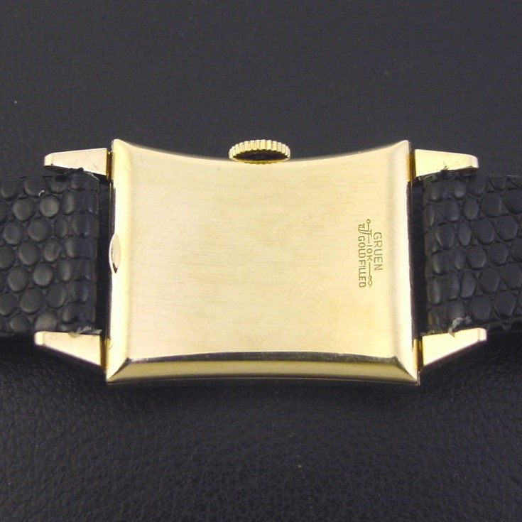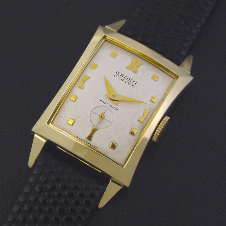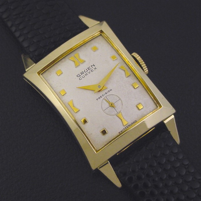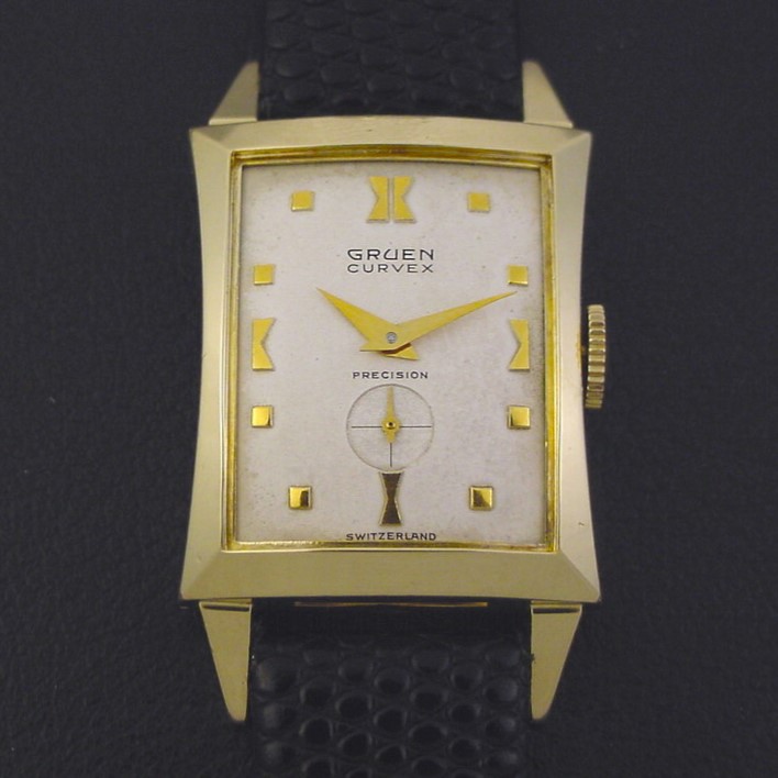 Gruen "Curvex Heritage" men's Mid-Century Modern design wristwatch in 10K yellow gold fill, circa 1952.