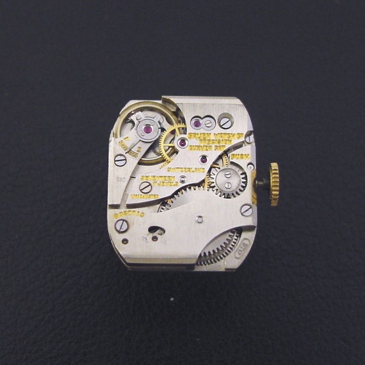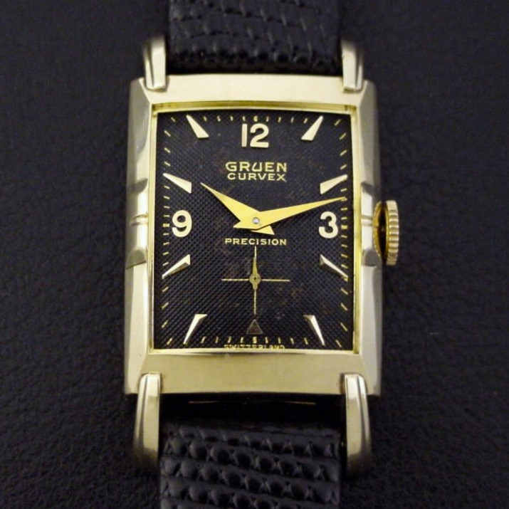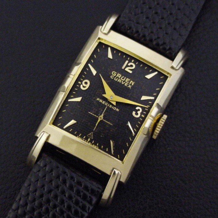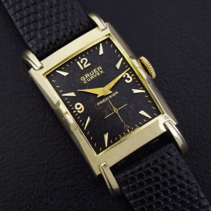The "Curvex Kent" has a long, curved case with stepped lugs and a notched bezel. It is very scarce with the black waffle-textured dial, and this is the only example I have ever offered. It is in crisp, excellent condition with no brassing. Caseback is superb and unengraved. The case measures 41mm long and 24mm wide. Original black-nickel finish gilt waffle-textured dial is excellent. Has new glass crystal. The watch is powered by its correct 17-jewel Gruen Curvex grade 370 manual wind movement just serviced and running strong.