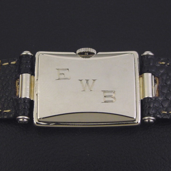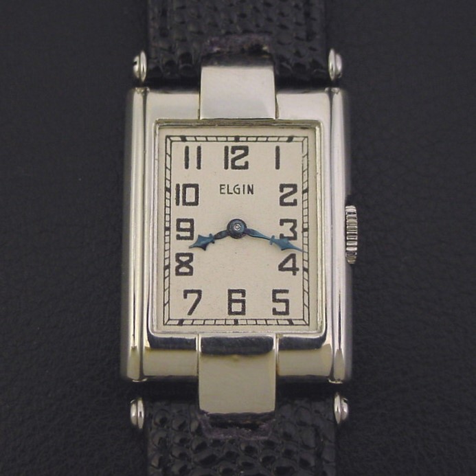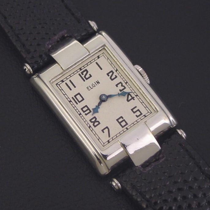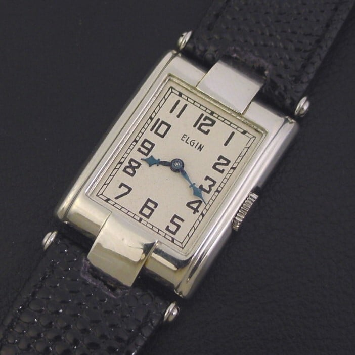 Scarce Elgin “Model 1156” men’s Art Deco design wristwatch in 14K white gold fill, circa 1933.