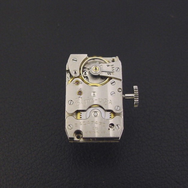 This unusual model has center lug mounts which take a notched strap held with screw pins like the Hamilton "Mount Vernon" model... both cases were produced by Schwab & Wuischpard. It is a scarce model and this is one of only a few I have ever offered. It was priced at $42.50 in 1933. This example is in excellent condition with only very faint brassing to the highpoints of the bezel and lugs. Caseback is excellent, with a monogram. The case measures 39mm long and 23mm wide. Older refinished dial is excellent. Has new glass crystal. This watch is powered by its correct 15-jewel Elgin grade 484 manual wind movement, just serviced and running strong.