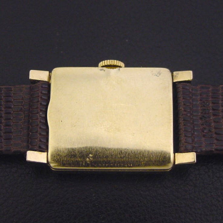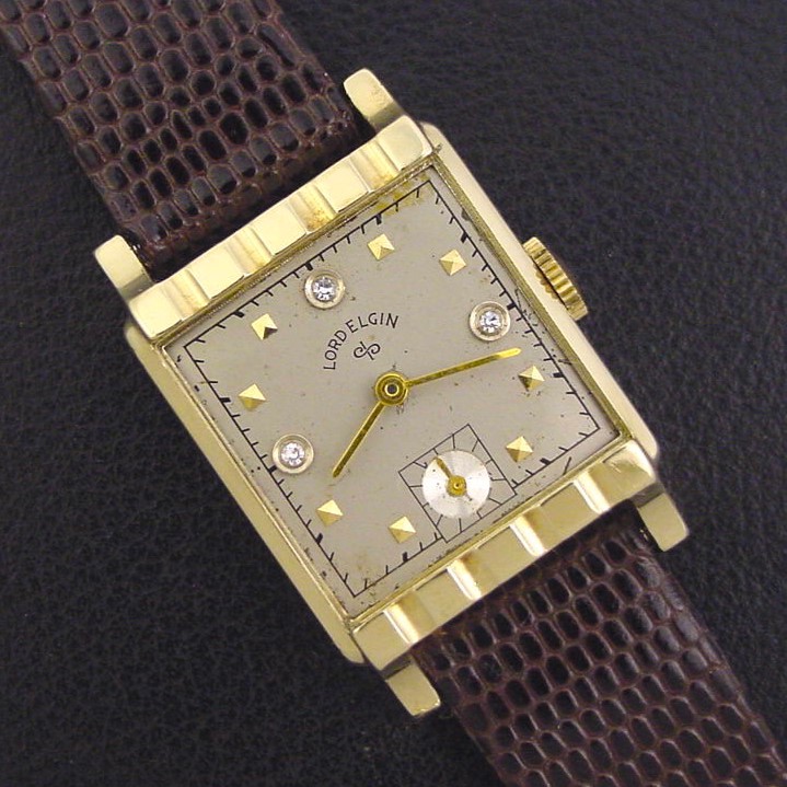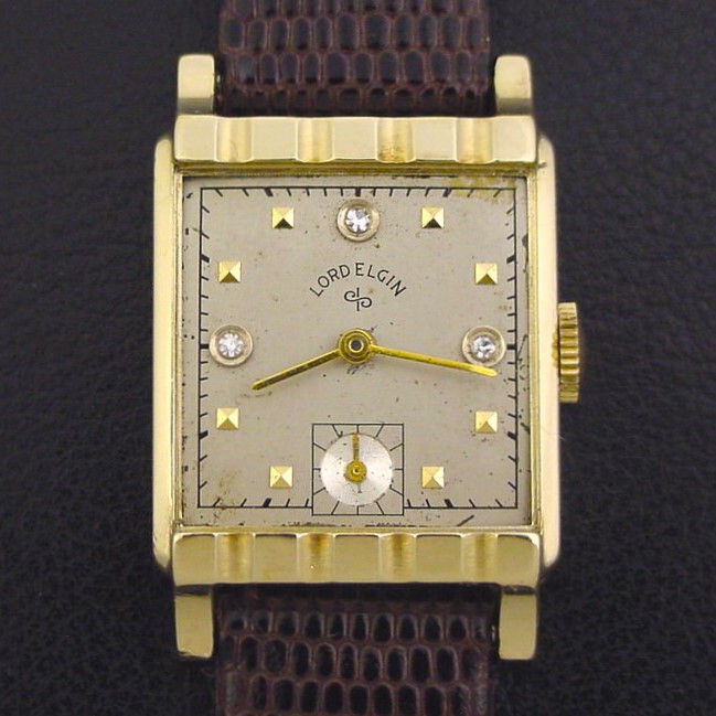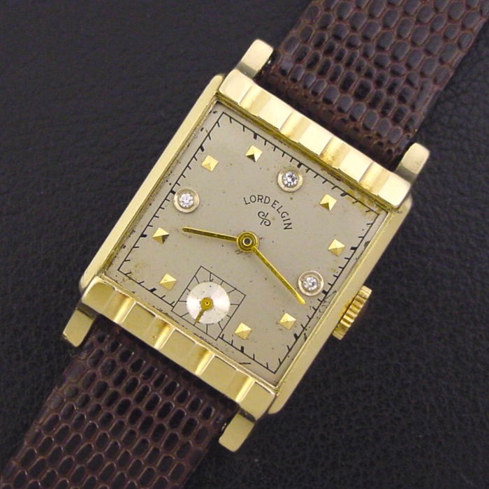 Very rare Lord Elgin "Model 4526 Diamond Dial" men's Retro Modern design wristwatch in 14K yellow with factory diamond dial, circa 1951.
