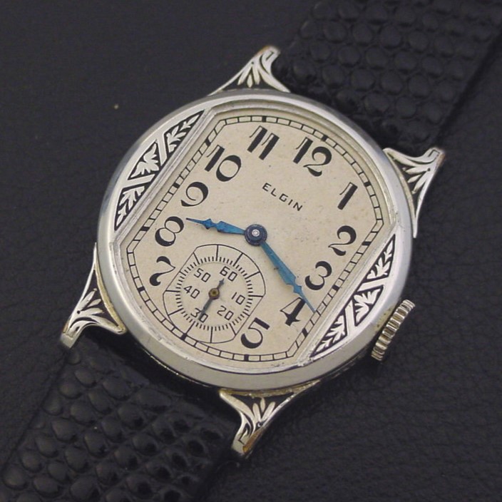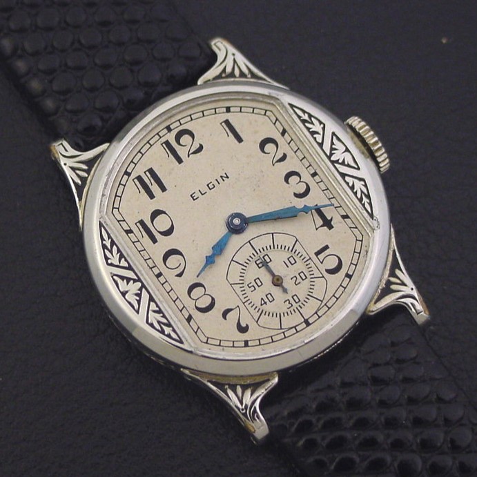 This uncatalogued watch is an updated version of the original "Model E-4" from 1928... it has a bezel engraved with spectacular stylized eagle designs on each side. It is a rare model and this is one of only three I have ever offered. It is in excellent condition with only a few specks of brassing to the lugs. Caseback is excellent and unengraved. Case measures 34mm long and 28mm wide. Original dial is excellent. Has new glass crystal. The watch is powered by its correct 15-jewel Elgin grade 428 manual wind movement, just serviced and running strong.