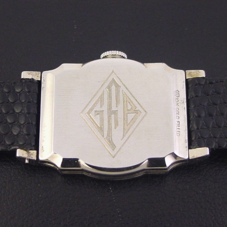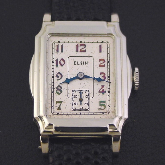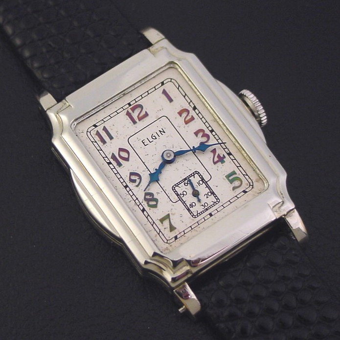 This elaborate stepped and flared design was catalogued only in 1935, priced at $37.50. It is a very scarce in white and difficult to find without heavy wear. This example is in excellent condition with only a few tiny specks of brassing to the highpoints of the bezel and lugs. Caseback is superb, with a fantastic Art Deco monogram. The case measures 40mm long and 27mm wide. Original dial is very good, with some light spotting. Embossed numerals have developed a beautiful blue and violet patina. Has new glass crystal. This watch is powered by its correct 17-jewel Elgin grade 489 manual wind movement, just serviced and running strong.