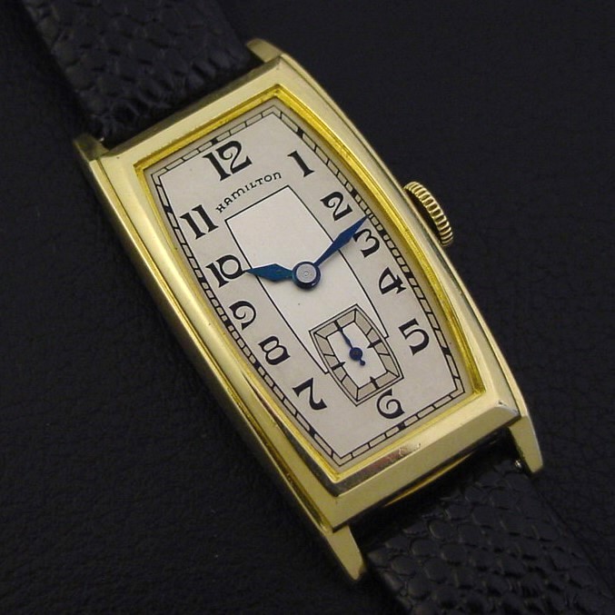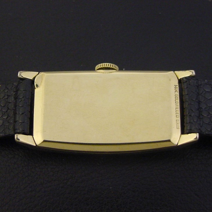 Very scarce Hamilton “Carlisle” men's Streamline Moderne design wristwatch in 14K yellow gold fill, circa 1938.