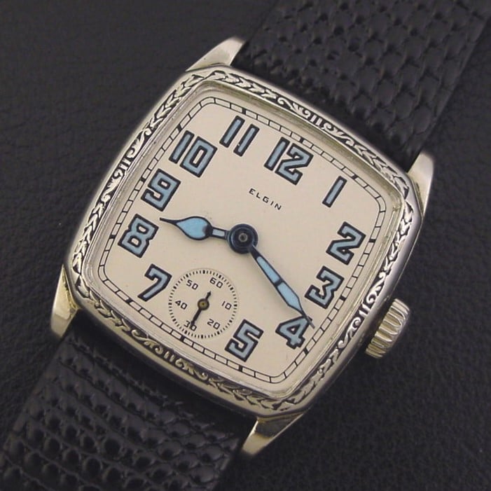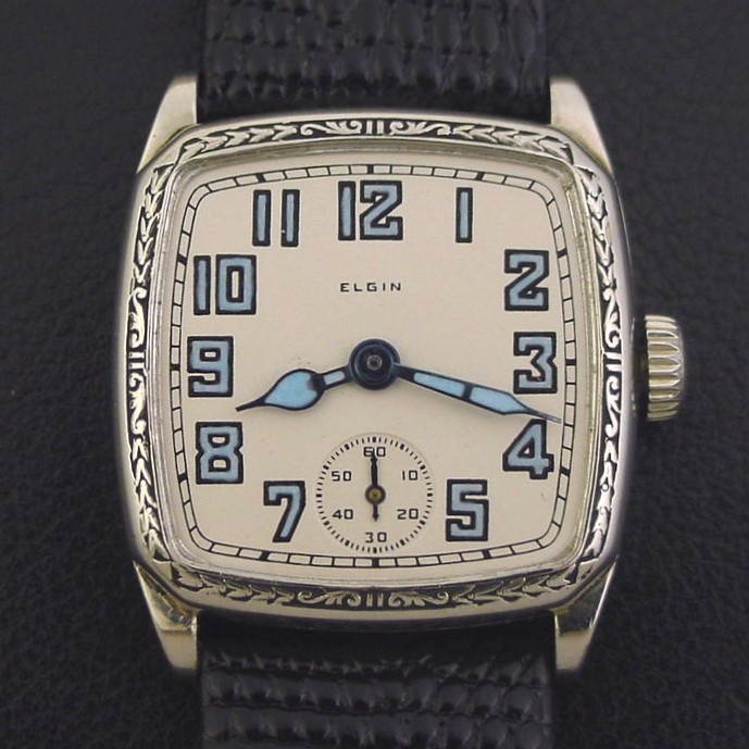 The “Legionnaire 418” has a large cushion-shaped case with an engraved bezel and was priced to consumers at $27.50 in 1928. This example is in crisp, excellent condition with no brassing. Caseback is excellent and unengraved. The case measures 35mm long and 29mm wide. Has new glass crystal. Factory-original new-old-stock dial is superb, has new special blue luminous. The watch is powered by its correct 7-jewel Elgin grade 485 manual wind movement, just serviced and running strong.