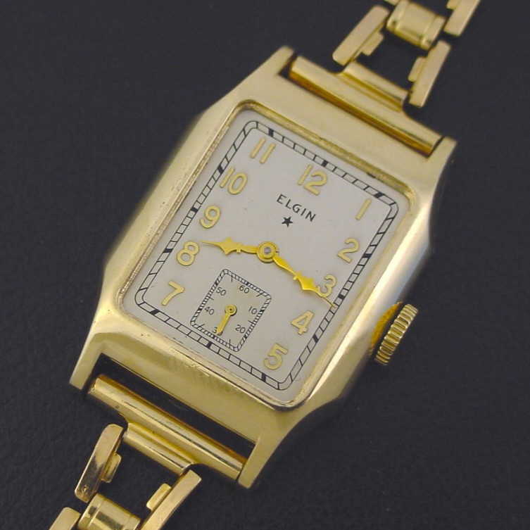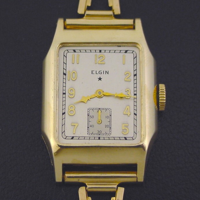 The "Crusader 2813" has a large, beveled case and was priced at $42.50 when fitted with a yellow gold-filled bracelet. This example is in crisp, near mint condition with only a few specks of brassing to the tips of the lugs. Caseback is superb, with a Masonic presentation from 1936. Case measures 38mm long and 26mm wide. Original two-tone is superb. Original glass crystal is superb. The watch is powered by its correct 17-jewel Elgin grade 524 manual wind movement, just serviced and running strong. Bracelet will adjust to fit wrist size of 7 inches to 7-1/2 inches. I can also remove a links to make it shorter.