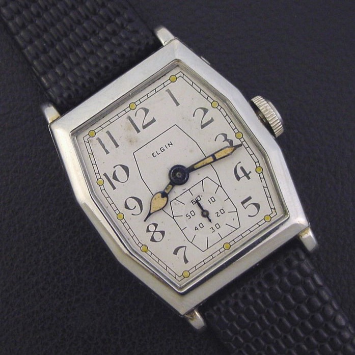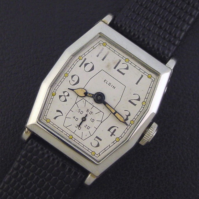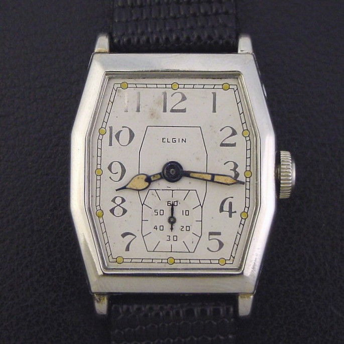 The "States 671" was originally introduced around 1930 as part of Elgin's "Lugless" series which had an awkward sliding pin that allowed the strap to be attached inside each end of the case for a smooth, seamless appearance. Around 1932, Elgin replaced that troublesome arrangement and offered this re-designed case with conventional lugs. It is a rare model and this is only the third example I have ever offered. It is in excellent condition showing only few specks of brassing to the bezel corners. Caseback is excellent and unengraved, with a few specks of wear in the corners. The case measures 39mm long and 27mm wide. Glass crystal is excellent. Older refinished dial is excellent, has unusual silver inlaid numerals and luminous dots. The watch is powered by its correct 15-jewel Elgin grade 428 manual wind movement, just serviced and running strong. Has original stepped crown.