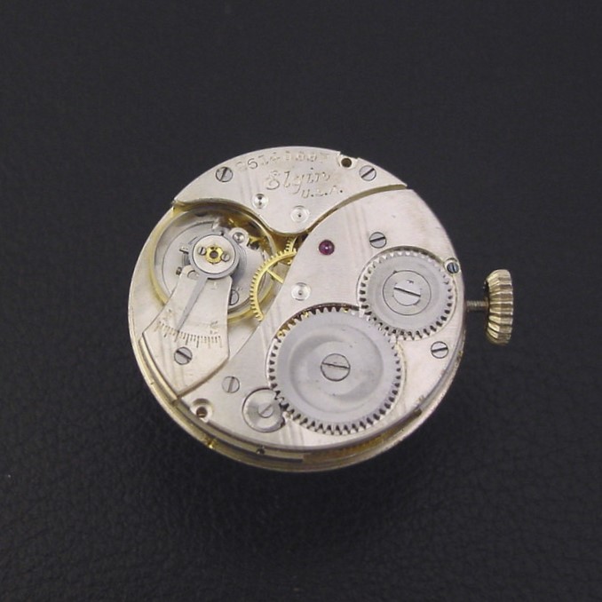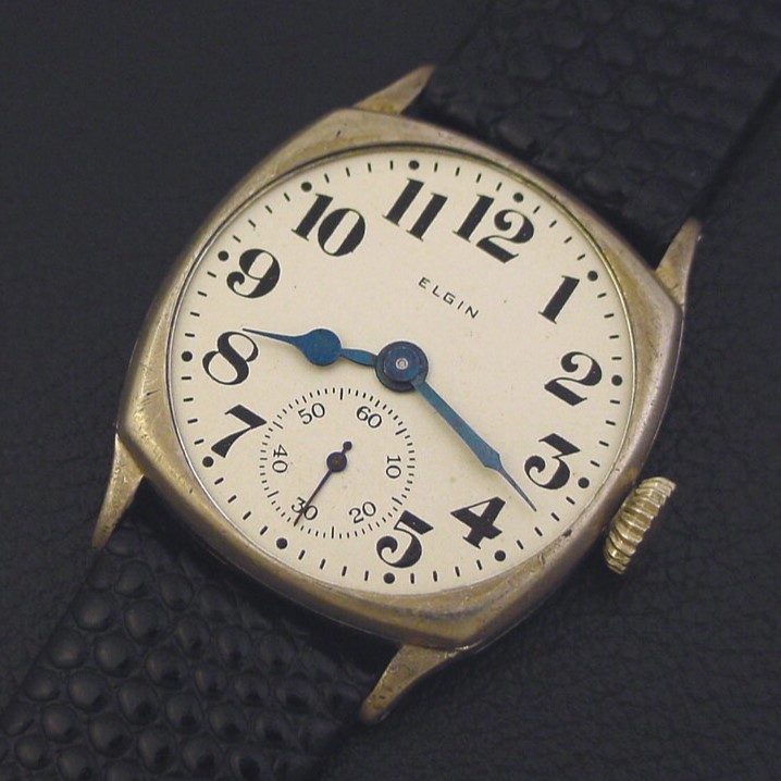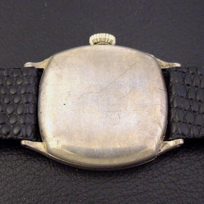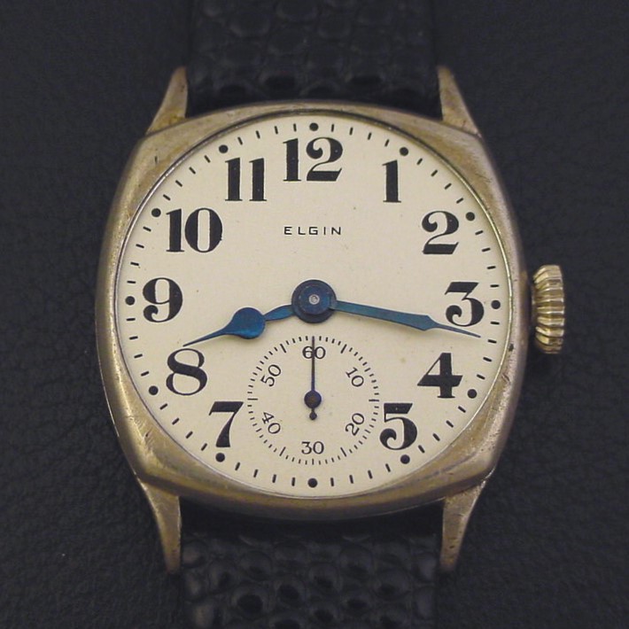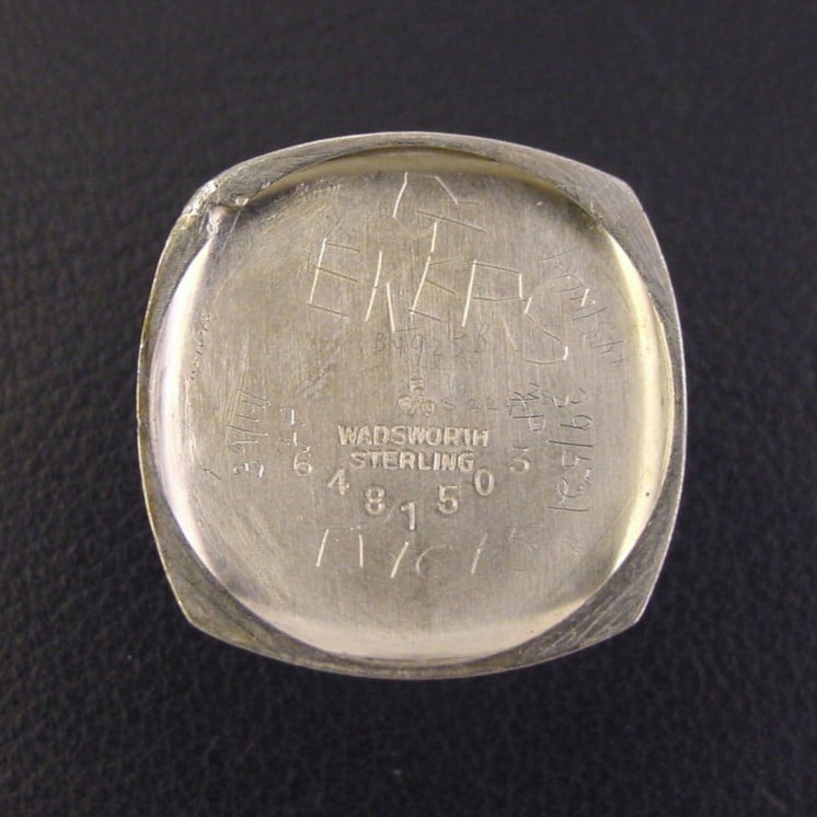 This simple, understated model has a case made by the Wadsworth Case Co. and houses an Elgin 6/0-size movement. It is in excellent condition showing only very slight wear. Sterling silver case has a soft, gray patina. Caseback is excellent and unengraved. The case measures 34mm long and 28mm wide. Original white finish dial is superb. Has new glass crystal. The watch is powered by a 7-jewel Elgin grade 430 manual wind movement, just serviced and running strong.