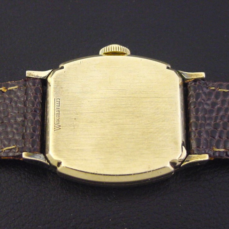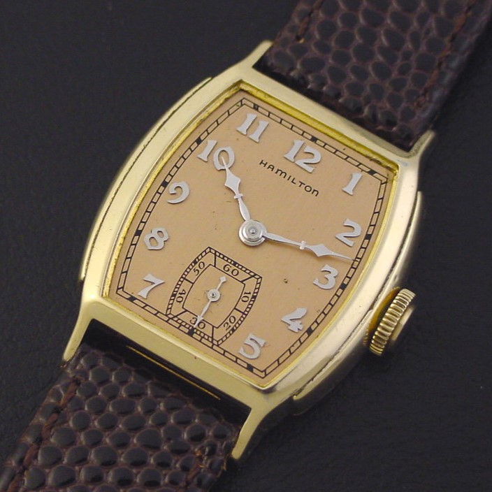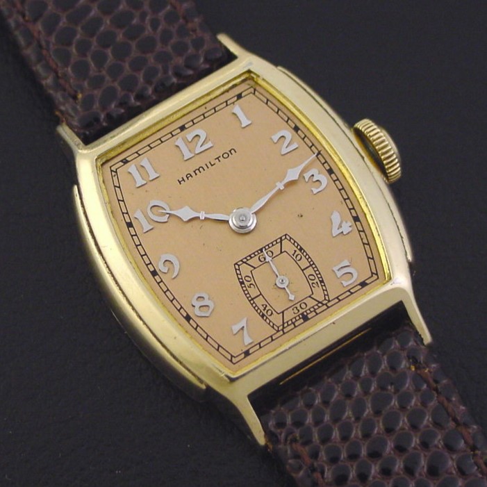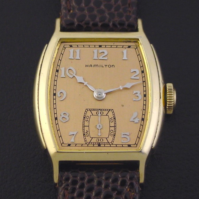 Scarce Hamilton "Douglas" men's Art Deco design wristwatch in 10K yellow gold fill, circa 1940.