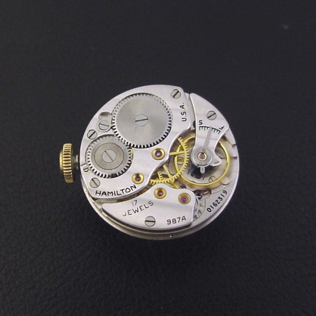The "Douglas" is a reincarnation of the 1936/1937 "Morley" model. It has the same case as the "Morley" but was redesigned with a spectacular coral finish dial with rhodium-plated 18K gold applied numerals and matching rhodium-plated hands. It was pictured only the 1940 and 1941 catalogues. It is a scarce watch with an exceptional case and dial such as this example. It is in excellent condition with only a few tiny specks of brassing. Caseback is excellent and unengraved with no wear spots. The case measures 35mm long and 27mm wide. Has new glass crystal. Original coral finish dial is excellent. The watch is powered by its correct 17-jewel Hamilton grade 987A manual wind movement, just serviced and running strong. Has original stepped crown.