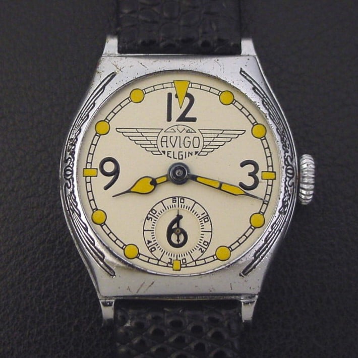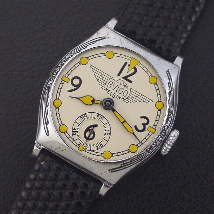 Aviation was all the rage in the 1930s and Elgin introduced a series of aviation-themed watches to capitalize on the aviation craze. The "Avigo" has a cushion-shaped case with Art Deco stylized wings engraved on the bezel highlighted with black inlay, and an Army Air Corps specification dial with large numerals and the winged Avigo logo. It was priced at $22.50 in 1931. The watch is in excellent condition showing only very light wear and some light scratches. Caseback is fair, with some pitting and wear through to the underlying nickel base. Case measures 37mm long and 30mm wide. Refinished dial is superb. Has new glass crystal. The watch is powered by its correct 7-jewel Elgin grade 485 manual wind movement, just serviced and running strong.
