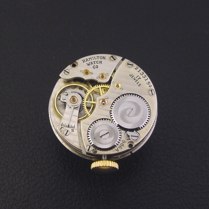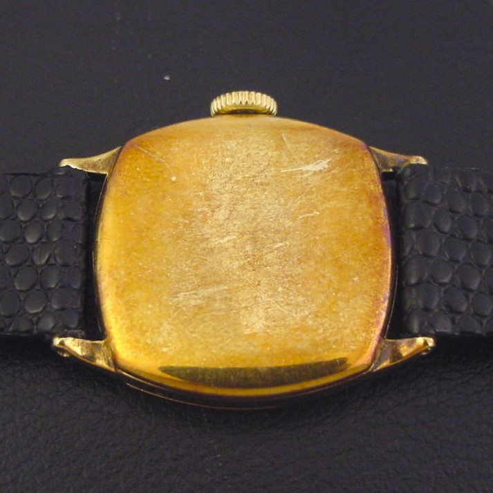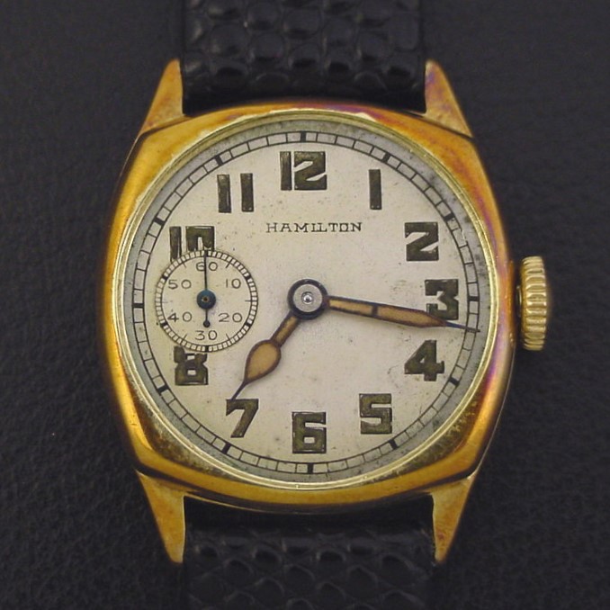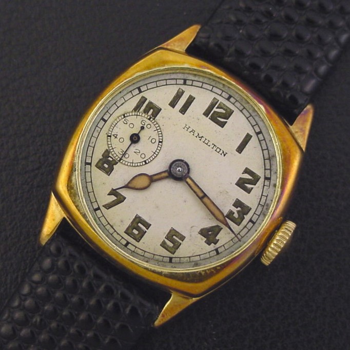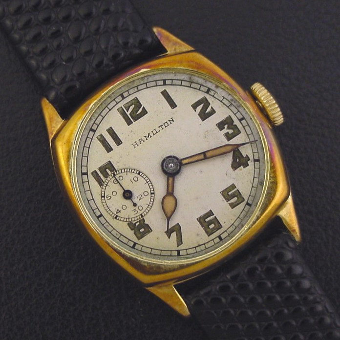 Very rare Hamilton “Cushion” men’s Modern design wristwatch in solid 14K green gold, circa 1926.