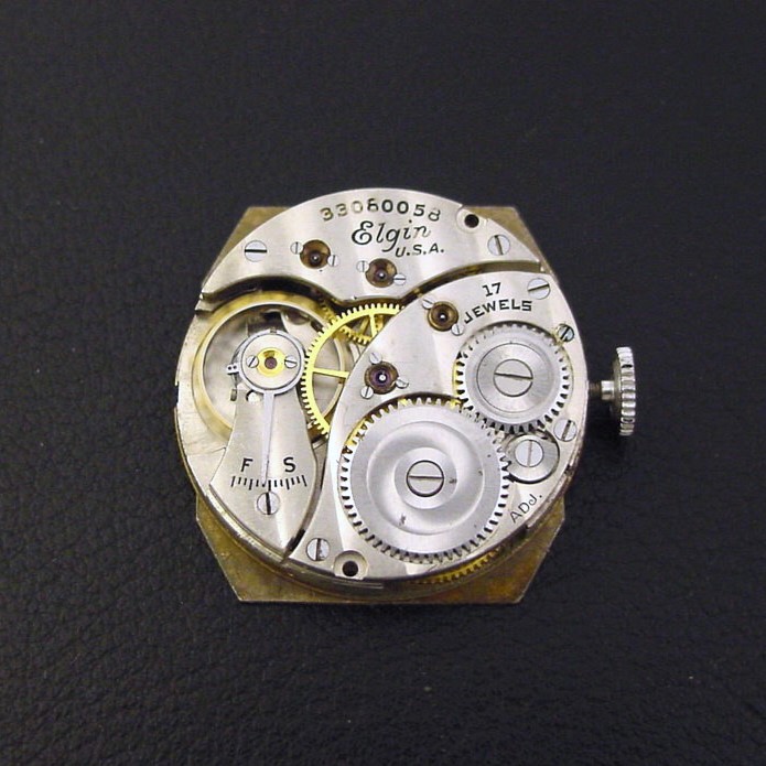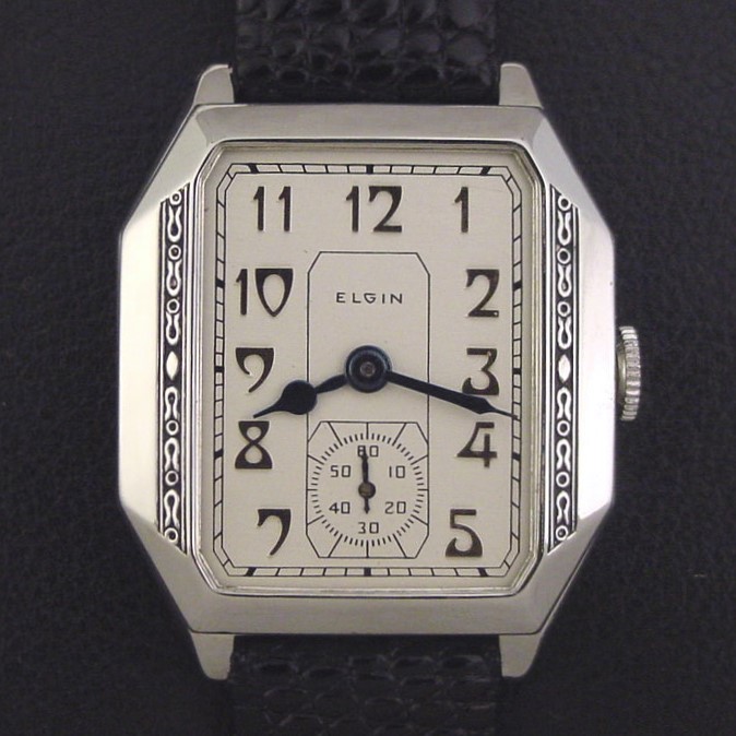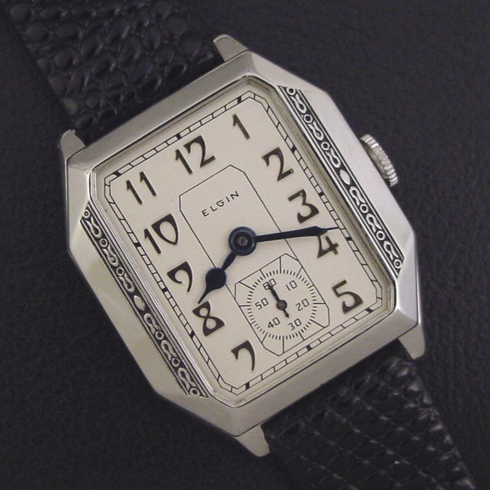 The "American Efficiency 462" has a large case with a sharply beveled and angled bezel. It was priced at $37.50 in 1930. This example is in excellent condition with only a few specks of brassing to the bezel corners. Caseback is excellent and unengraved. The case measures 38mm long and 30mm wide. Original dial is superb, has gold embossed Egyptian numerals. Glass crystal is excellent. The watch is powered by its correct 17-jewel Elgin grade 487 manual wind movement, just serviced and running strong.