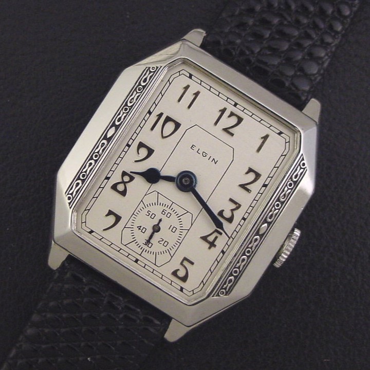 Scarce Elgin "American Efficiency 462" men's Machine Age design wristwatch in 14K white gold fill, circa 1930.