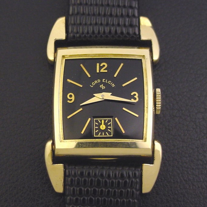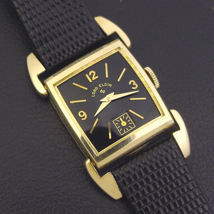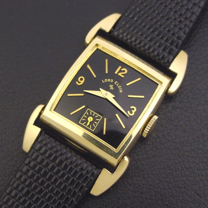 Scarce Lord Elgin "Model 4625" men's Retro Modern design wristwatch in 14K yellow gold fill, circa 1952.