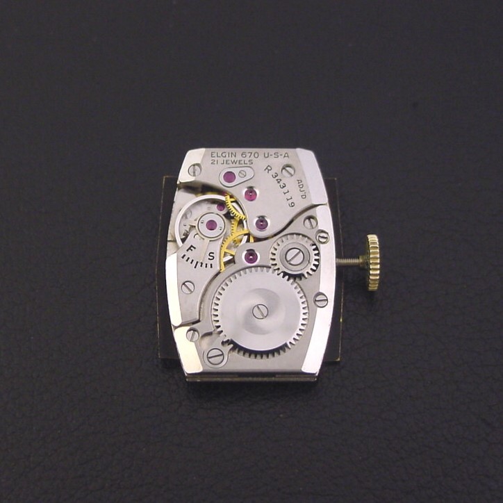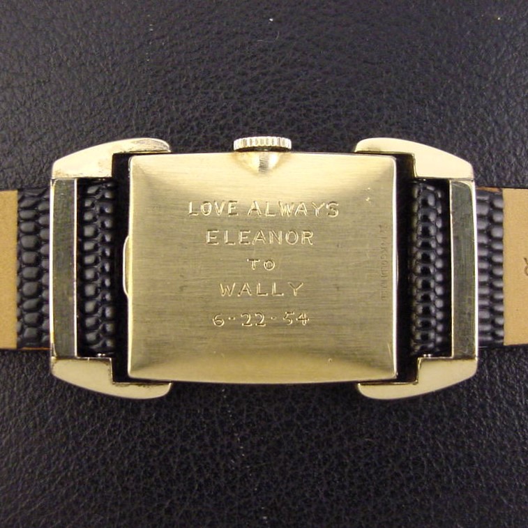 The "Model 4625" has large, flexible and angled lugs and was priced at $71.50 in 1952. It is quite scarce with the black dial. This example is in crisp, near mint condition with no brassing. Caseback is superb, with a presentation engraving. Case measures 44mm long and 24mm wide. Original black nickel finish dial is superb, has solid 18K gold applied numerals and markers. Has new glass crystal. The watch is powered by its correct 21-jewel Elgin grade 670 manual wind movement, serviced a few years ago and still running strong.
