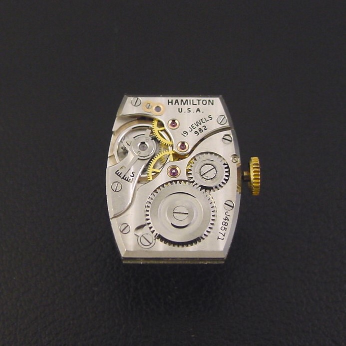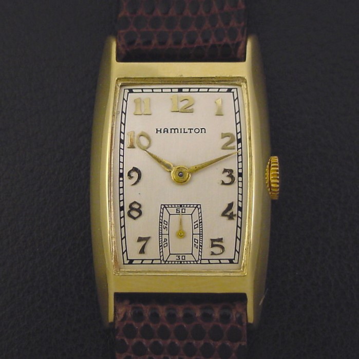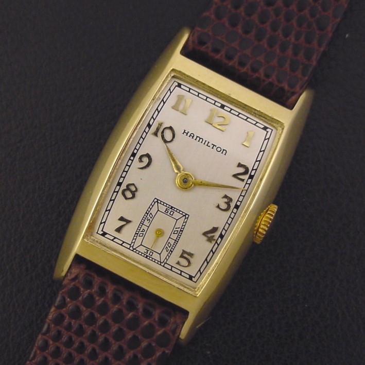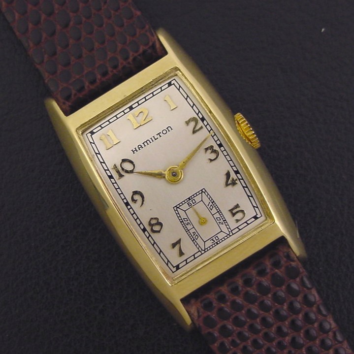Rare Hamilton “Cameron” men’s Streamline Moderne design Packard Motor Car Co. presentation wristwatch in solid 14K yellow gold, circa 1938.
