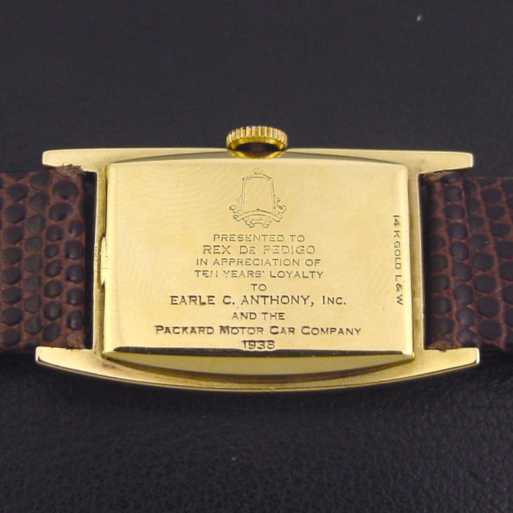 Hamilton's prestige and reputation for quality made it the watch of choice for special presentations, awards, and gifts of esteem. Hamilton produced this specially engraved version of its “Cameron” model for the Packard Motor Car Co. in 1937 and 1938 as awards for employees with 10 years of service to Packard. These were special order watches and the presentation inscriptions on the casebacks were acid-etched at the Hamilton factory prior to shipment. Hamilton only produced 339 of these watches for Packard and this is the first I have offered in several years. It is in excellent condition showing only very light wear. Caseback is excellent and bears the special Packard crest and presentation engraving for 10 years of service to the Packard Motor Car Co. and Earle C. Anthony, Inc. of Los Angeles, the Packard distributor for California. Case measures 37mm long and 22mm wide. Refinished dial is superb, has solid 18K gold applied numerals. Has new glass crystal. The watch is powered by its correct 19-jewel Hamilton grade 982 manual wind movement, just serviced and running well.