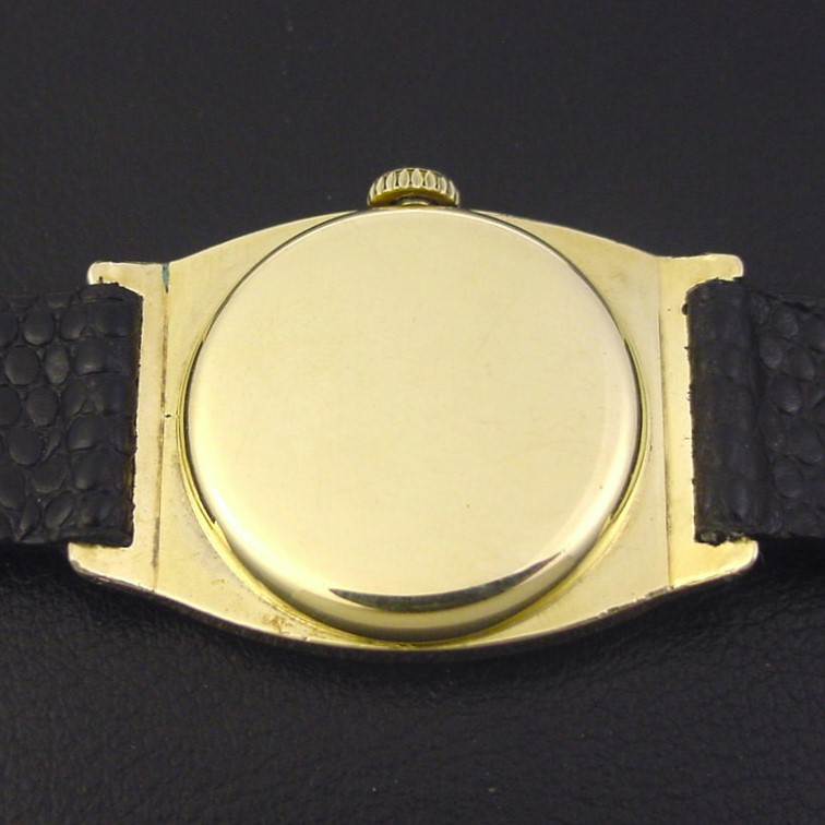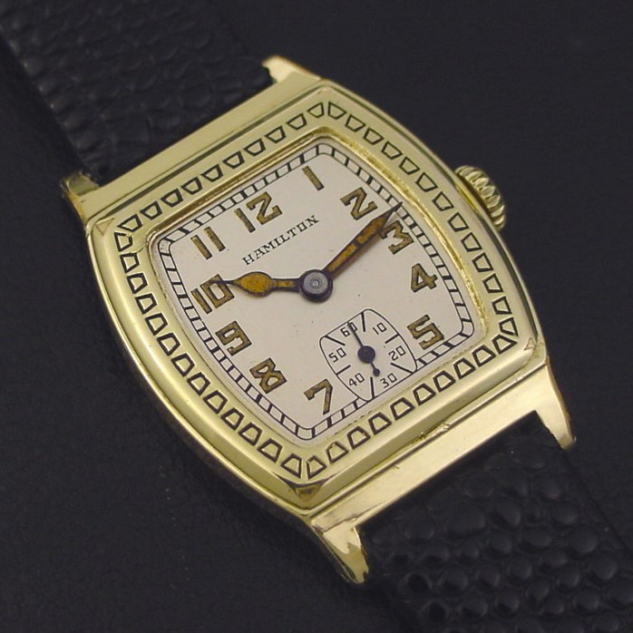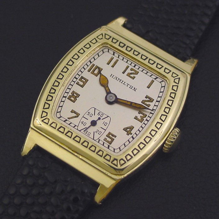 Scarce Hamilton “Raleigh Engraved” men’s Art Deco design wristwatch in 14K green gold fill, circa 1929.