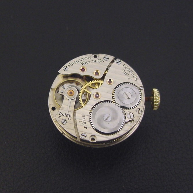 This is the first version of the “Raleigh Engraved” and has an Art Deco stylized keystone pattern engraved on the bezel. This is a scarce model, with only 1,999 watches produced in green, and this is first I have offered in many years. It is in excellent condition with only a few specks of brassing to the bezel corners and light brassing to the lugs. The caseback is excellent and unengraved. The case measures 39mm long and 29mm wide. Older refinished dial is excellent. Has new glass crystal. The watch is powered by its correct 17-jewel Hamilton grade 987-F manual wind movement, just serviced and running strong. Original green crown shows light wear.