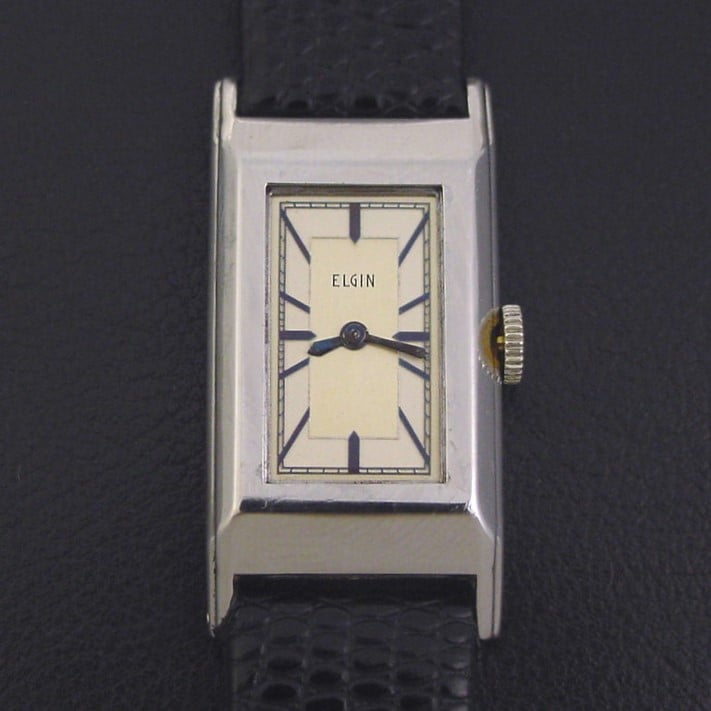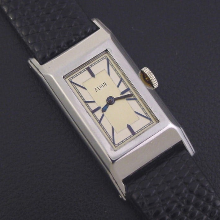 Scarce Elgin "Model 1270" men's Machine Age design wristwatch in stainless steel, circa 1935.