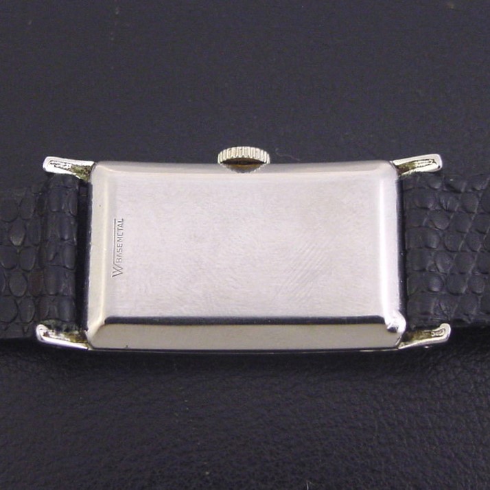 This smaller-sized men's model has an angled stainless steel case and was priced at $37.50 in 1935. It is a fairly scarce model due to its original high consumer price for a stainless steel model, and this is one of only a few I have ever offered. It is in excellent condition showing only light wear. Caseback is excellent and unengraved. The case measures 40mm long and 20mm wide. Has new glass crystal. Original two-tone dial is excellent, has raised blue tracks and hour markers. The watch is powered by its correct 17-jewel Elgin grade 483 manual wind movement, just serviced and running strong.