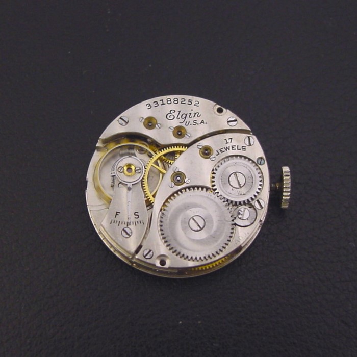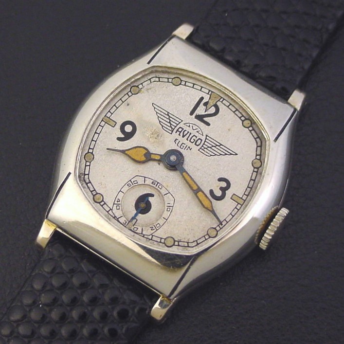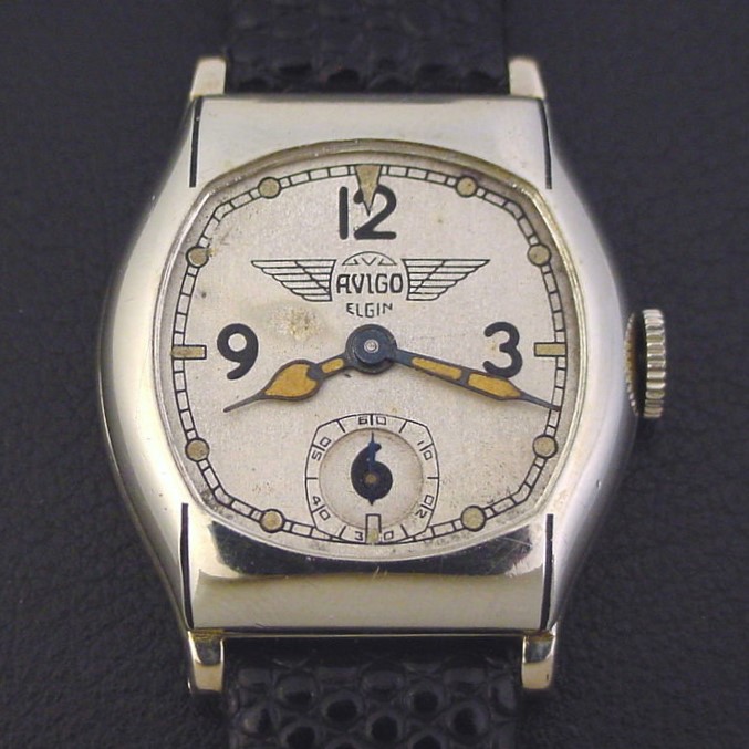 Aviation was all the rage in the 1930s and Elgin introduced a series of aviation-themed watches to capitalize on the aviation craze. The “Avigo 461” has an Army Air Corps specification dial with large numerals and the winged Avigo logo. It has a cushion-shaped case with incuse lines with black inlay in each bezel corner. It was priced at $40.00 in 1930. Unlike the other Avigo models which had chrome cases and 7-jewel movements, the "Avigo 461" has a gold-filled case with Elgin's highest grade 17-jewel 4/0-size movement, which accounted for it being priced twice as much as the chrome models. This example is in crisp, excellent condition with no brassing. Caseback is superb and unengraved. Case measures 37mm long and 30mm wide. Original dial is very good. Has new glass crystal. The watch is powered by its correct 17-jewel Elgin grade 487 manual wind movement, just serviced and running strong.
