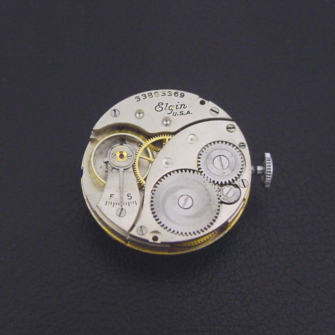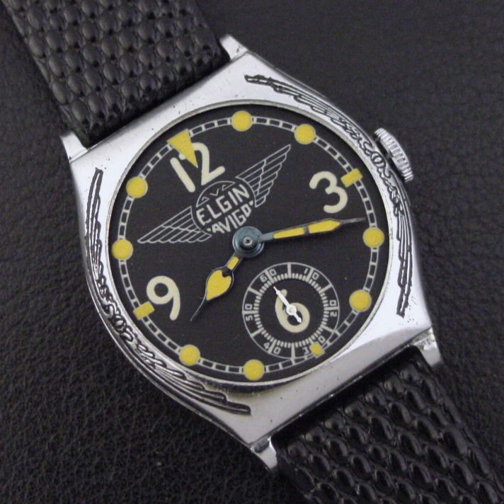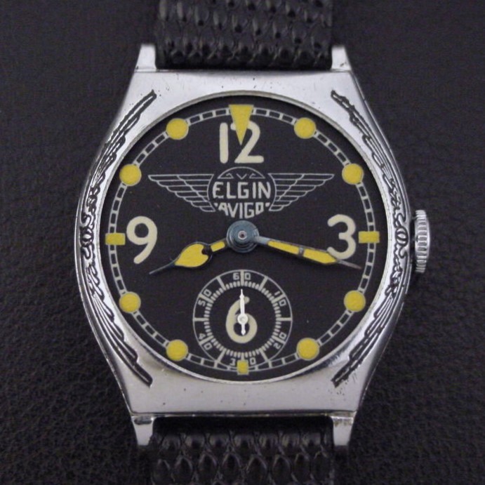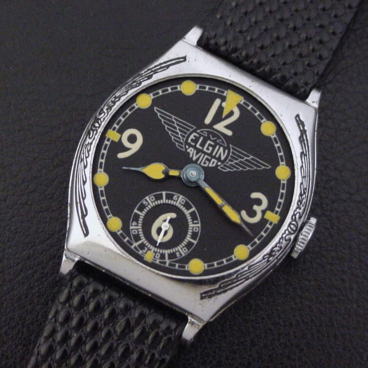Aviation was all the rage in the 1930s and Elgin introduced a series of aviation-themed watches to capitalize on the aviation craze. The “Avigo 428” has an Army Air Corps specification dial with large numerals and the winged Avigo logo. It has a cushion-shaped case with Art Deco stylized wings engraved on the bezel highlighted with black inlay. It was priced at $22.50 in 1932. The watch is in excellent condition showing only very light wear, but no pitting or corrosion to the chromium plating. Caseback is excellent unengraved. Case measures 37mm long and 30mm wide. Factory-original new-old-stock dial is superb, has new vintage-style luminous. Has new glass crystal. The watch is powered by its correct 7-jewel Elgin grade 485 manual wind movement, just serviced and running strong.