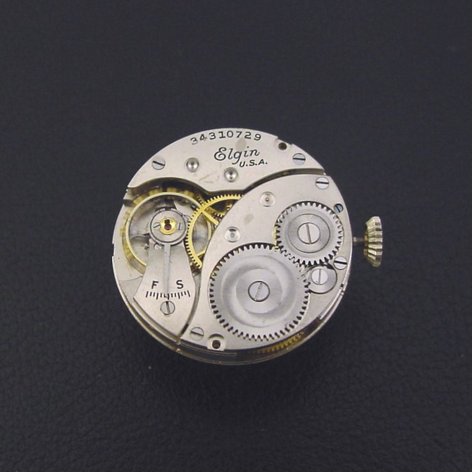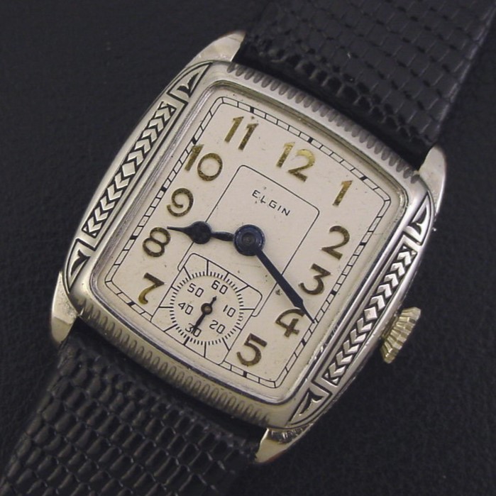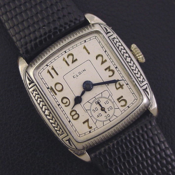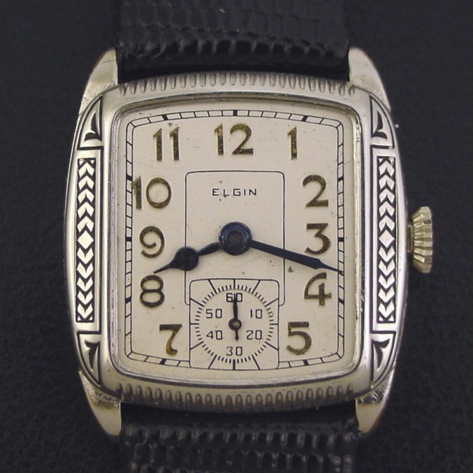 The "Legionnaire 423" has Art Deco engravings on the bezel and case sides with black inlay. It was priced at $29.50 in 1929. It is in excellent condition with only a few specks of brassing. Caseback is superb and unengraved. Case measures 35mm long and 29mm wide. Original dial is excellent, has gold embossed numerals. Has new glass crystal. Watch is powered by its correct 7-jewel Elgin grade 485 manual wind movement, just serviced and running strong.