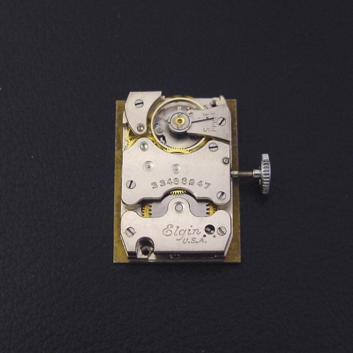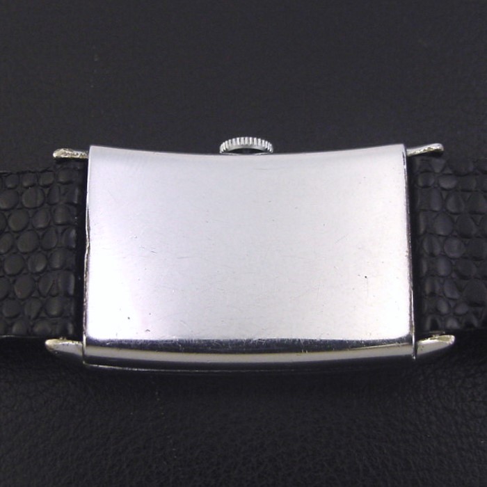 The "Campus 940" has a long, curved case and was priced at $29.75 in 1931. This example is in excellent condition showing only some light scratches and marks to the chromium plating. Caseback is excellent and unengraved, with no pitting. The case measures 40mm long and 23mm wide. Has new glass crystal. Original dial is superb, has gold embossed numerals. The watch is powered by its correct 7-jewel Elgin grade 488 manual wind movement, just serviced and running strong.