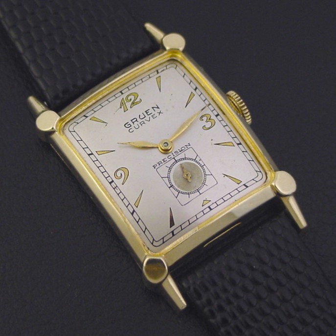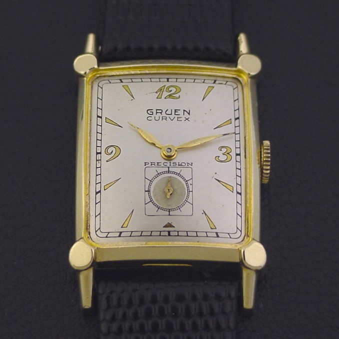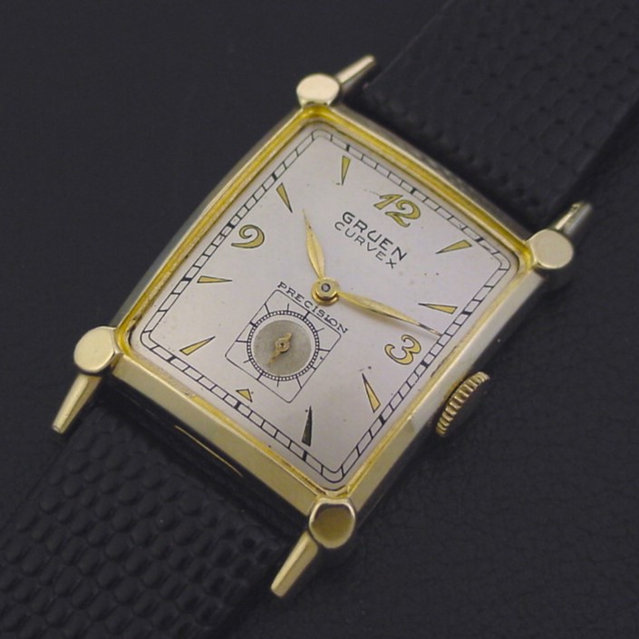 Gruen "Curvex Marshall" men's Retro Modern design wristwatch in 10K yellow gold fill, circa 1950.