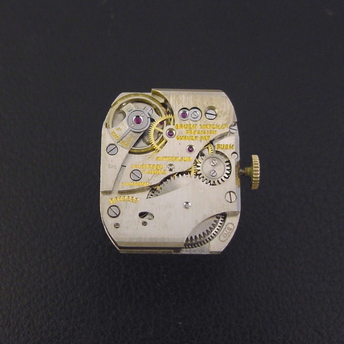 The "Marshall" is one of the final Curvex models. By the early 1950s, Gruen shifted the focus of the "Curvex" line more to case design rather than emphasizing case length and curvature. This example is in crisp, excellent condition with no brassing. Caseback is excellent and unengraved. The case measures 37mm long and 24mm wide. Acrylic crystal is excellent. Original dial is excellent. The watch is powered by its correct 17-jewel Gruen grade 370 Curvex manual wind movement, just serviced and running strong.