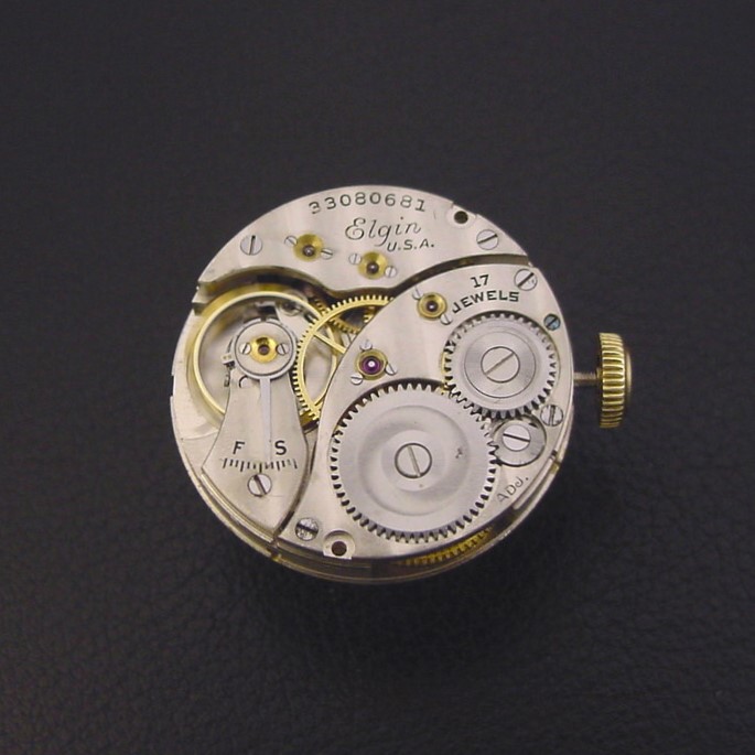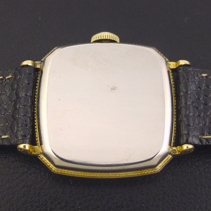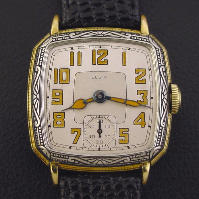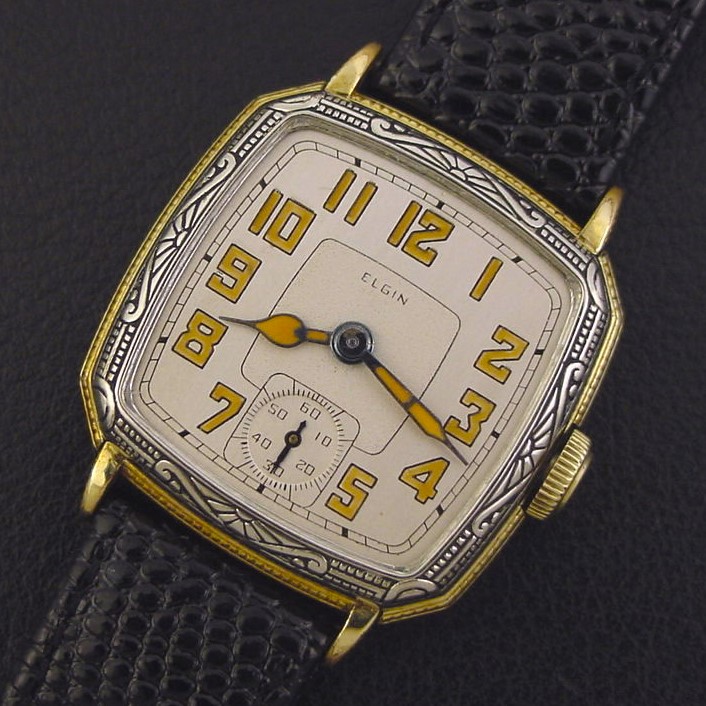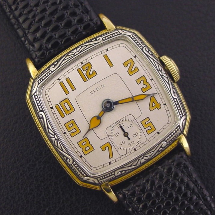 A larger-size watch, the “American Efficiency 451” has fancy stylized Art Deco engraved designs on the bezel and lugs with the center case body being green and the bezel and caseback being white. This example is in excellent condition with only a few specks of brassing to the lugs. Bezel engravings are crisp. Caseback is superb and unengraved. The case measures 37mm long and 31mm wide. Refinished two-tone dial is excellent. Has new glass crystal. This watch is powered by its correct 17-jewel Elgin grade 487 manual wind movement, just serviced and running strong. Has original stepped, green crown.