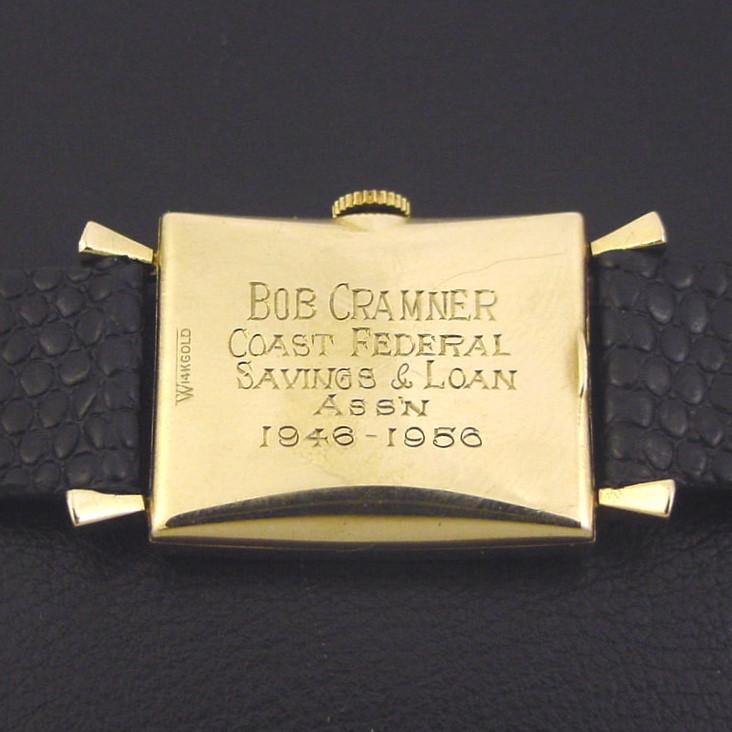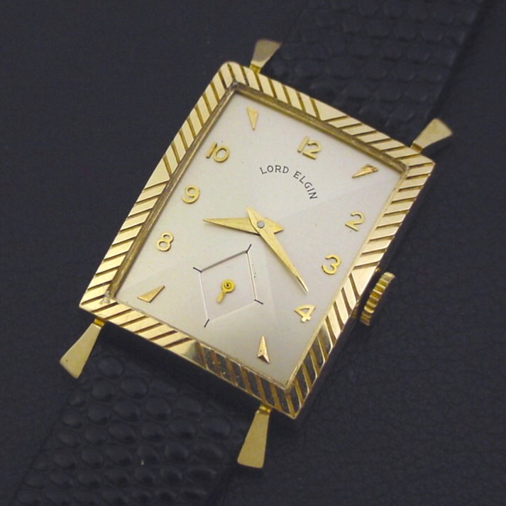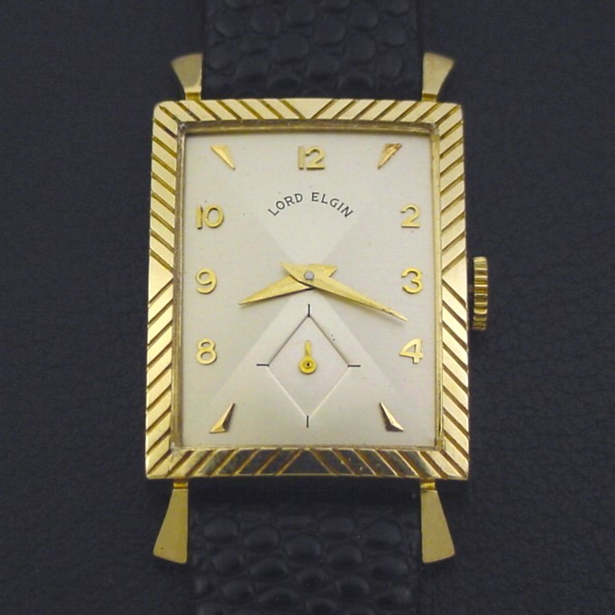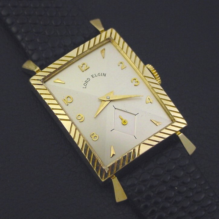 Very scarce Lord Elgin “Aberdeen” men’s Retro Modern design wristwatch in solid 14K yellow gold, circa 1956.