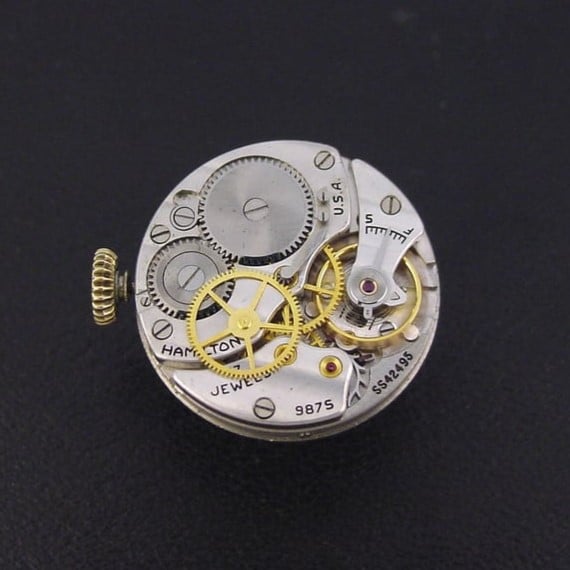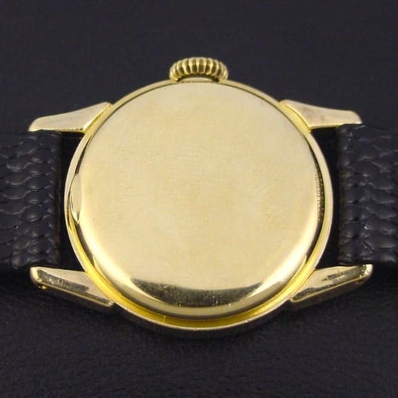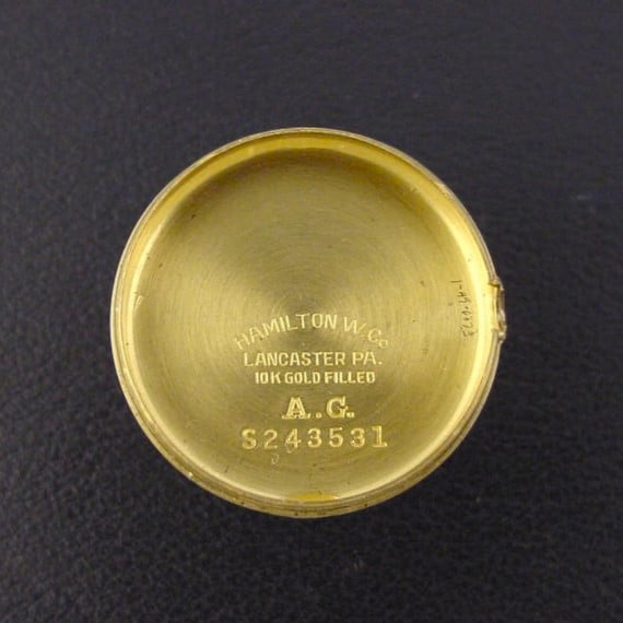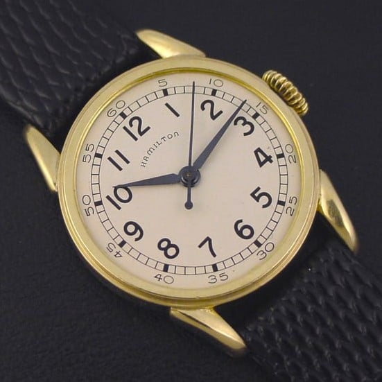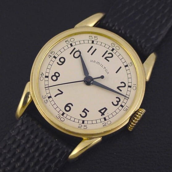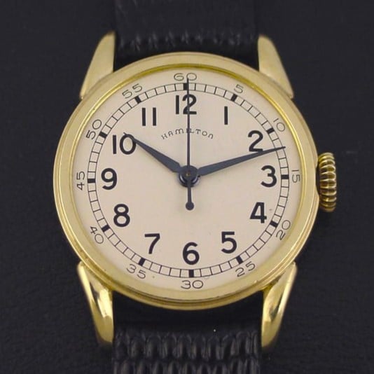 The “Sentinel” with the black Arabic numeral dial first appeared in 1942 and is quite scarce. Around 1943, Hamilton began producing watches with cases using gold over a sterling silver base, as brass had become a critical war material. These "Sentinel" cases are about 15% heavier than the usual ones and are stamped "A.G." in the caseback to denote this special case composition. This example is in excellent condition with no brassing. Caseback is excellent and unengraved, with no wear. The case measures 36mm long and 29mm wide. Original dial is excellent. Glass crystal is excellent. This watch is powered by its correct 17-jewel Hamilton grade 987S manual wind movement, serviced a few years ago and still running strong.