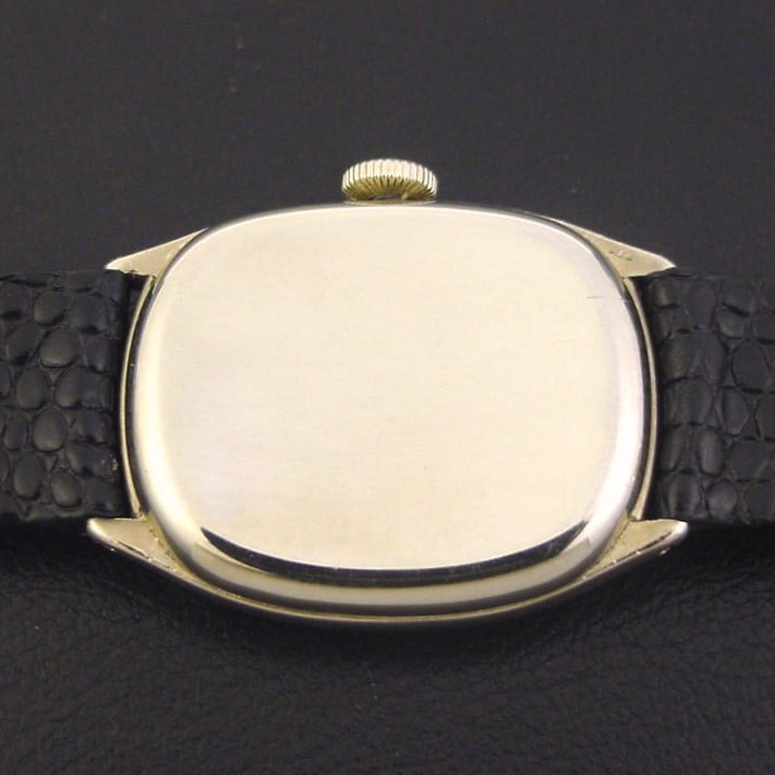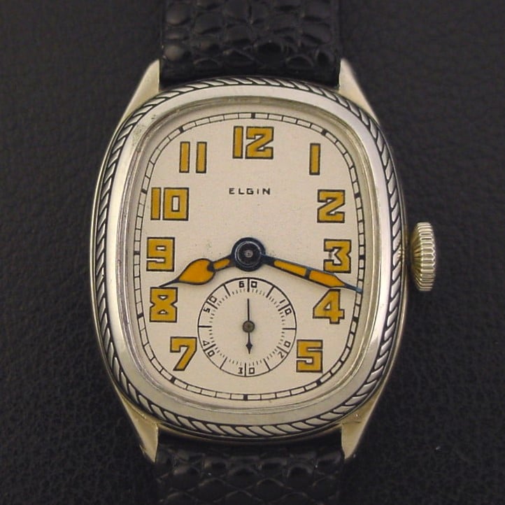 Scarce Elgin “Oval Engraved” men's Art Deco design wristwatch in 14K white gold fill, circa 1929.