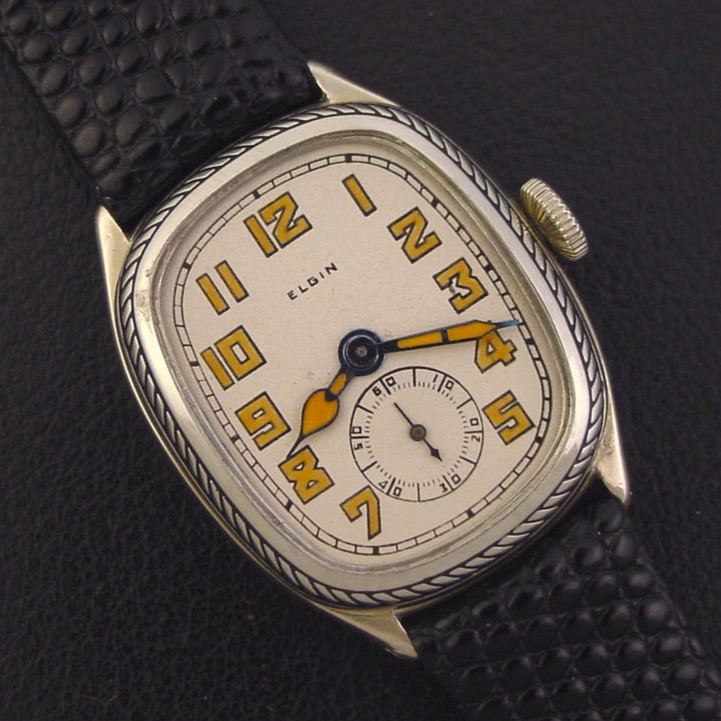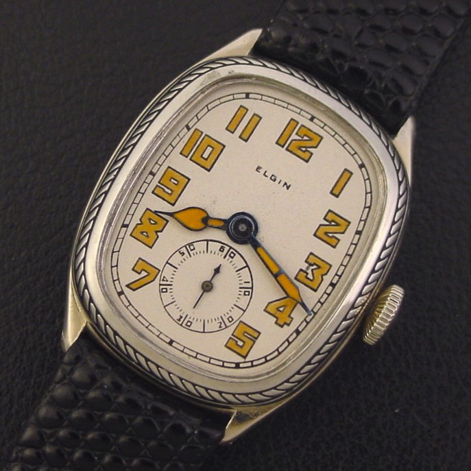 This watch was catalogued as the "Model 663" but most Elgin collectors refer to it as the "Oval" because of its remarkable resemblance to the Hamilton "Oval." Both were made by the Fahys Watch Case Co. It was priced at $48.00 in 1929. This example is in crisp, excellent condition with no brassing. Caseback is excellent and unengraved. Case measures 37mm long and 28mm wide. Refinished luminous dial is excellent. Has new glass crystal. The watch is powered by its correct 15-jewel Elgin grade 428 manual wind movement, just serviced and running strong.