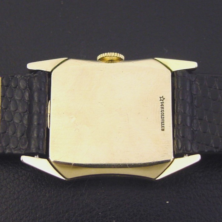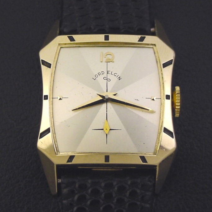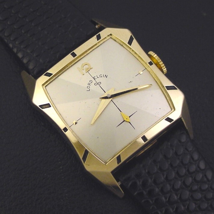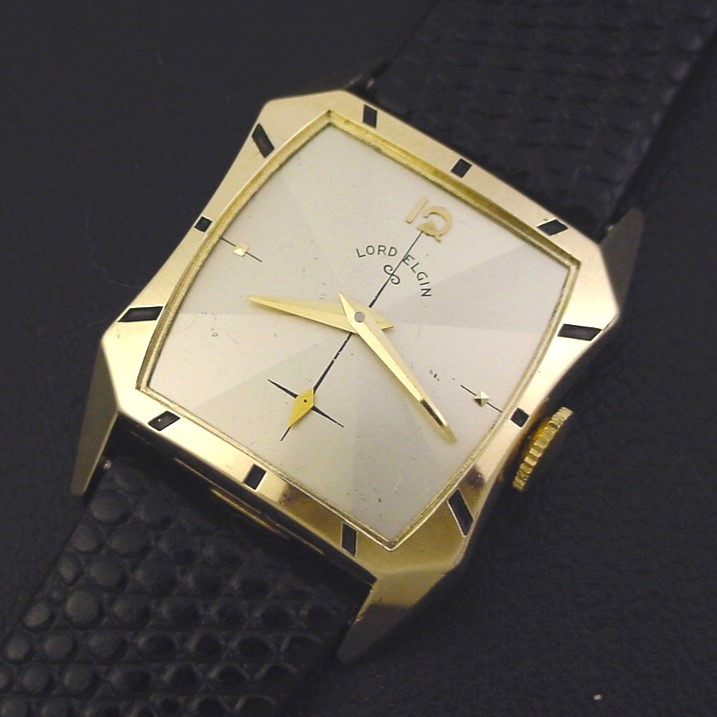Lord Elgin “Cranbrook” men’s Retro Modern design wristwatch in 14K yellow gold fill, circa 1954.