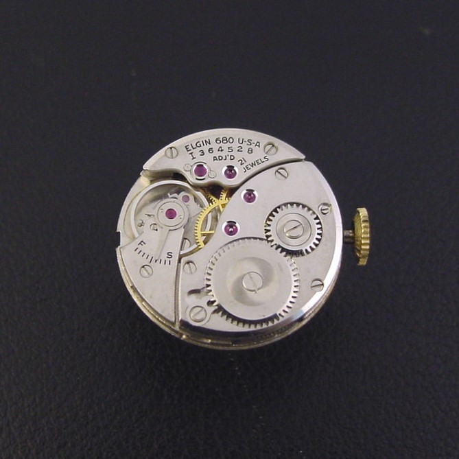 The “Cranbrook” has a black inlaid markers on the case and a two-tone sector-patterned dial. It was priced at $75.00 in 1954. This example is in excellent condition with no brassing. Caseback is excellent and unengraved, with some light marks. The case measures 37mm long and 27mm wide. Original two-tone dial is excellent. Acrylic crystal is excellent. The watch is powered by it correct 21-jewel Elgin grade 680 manual wind movement, just serviced and running strong.
