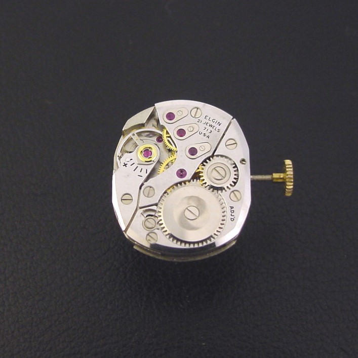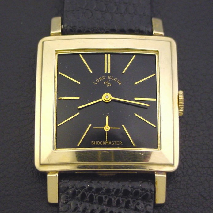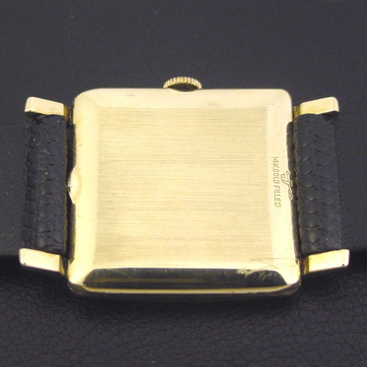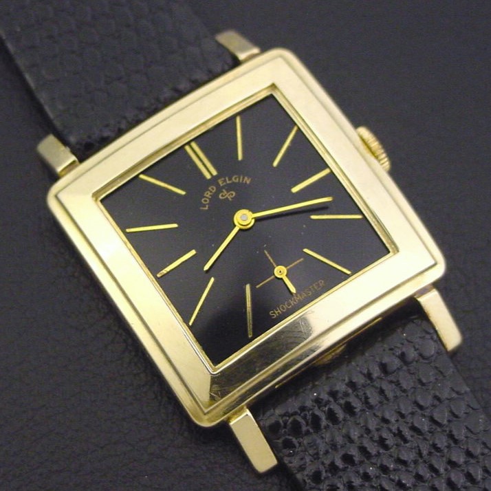 The "Westwood" has a large, square case with a stepped bezel. It was priced at $75.00 in 1957. This example is in crisp, excellent condition with no brassing. Caseback is excellent and unengraved, with some wear in the corners. Case measures 42mm long and 29mm wide. Original black nickel finish dial is superb. Has new acrylic domed crystal. The watch is powered by its correct 21-jewel Elgin grade 713 manual wind movement, just serviced and running strong.