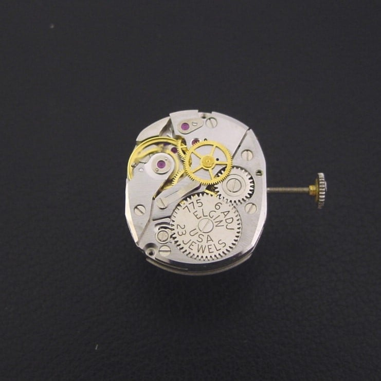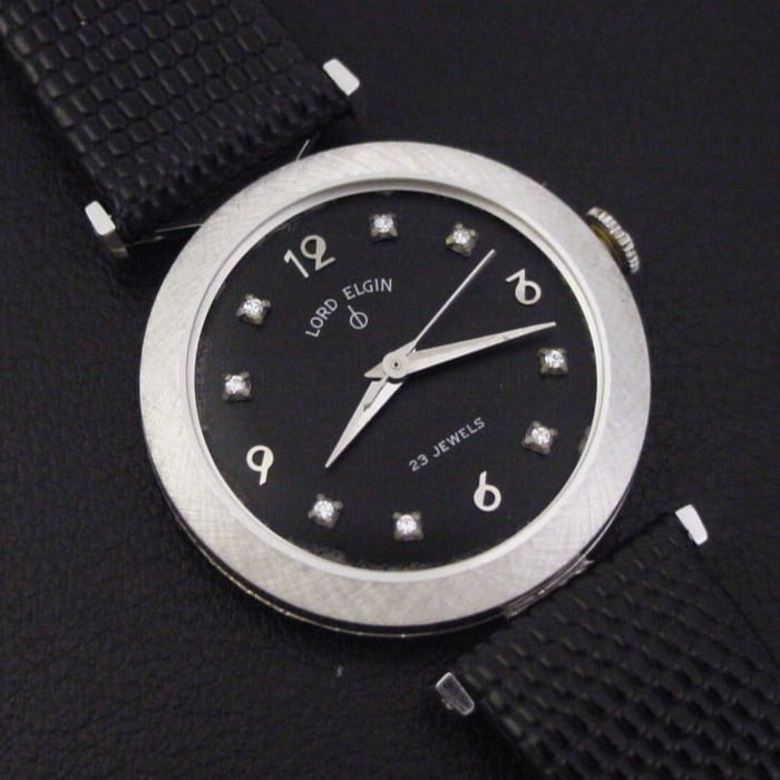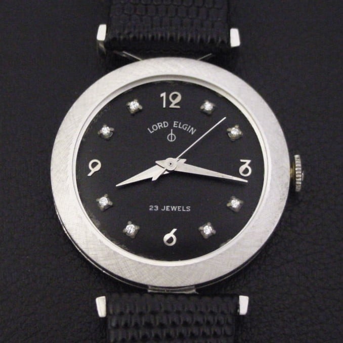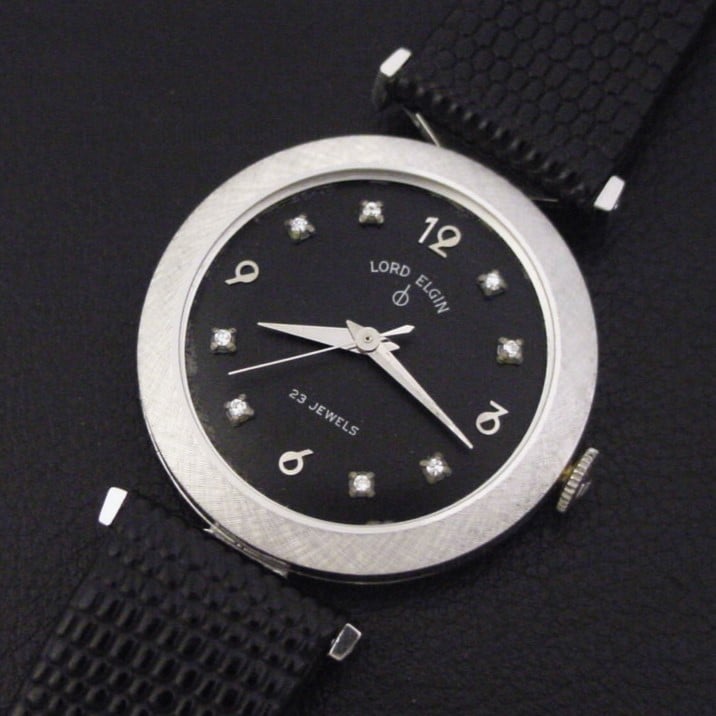 This solid gold Lord Elgin has a florentine-finish bezel and dramatic T-shaped lugs. It is a rare model and this is the first I have ever offered. It is in crisp, excellent condition showing almost no wear, just some light scratches on the side of the case. Caseback is superb and unengraved. Case measures 41mm long and 32mm wide. Factory-original black nickel-finish dial is excellent, has solid white gold numerals and markers set with genuine diamonds. Diamond-edge acrylic crystal is excellent. The watch is powered by its correct 23-jewel Elgin grade 775 manual wind movement, just serviced and running strong.