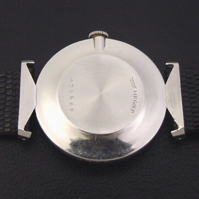 Rare Lord Elgin "Continental" men's Space Age design wristwatch in solid 14K white gold with diamond dial, circa 1960.
