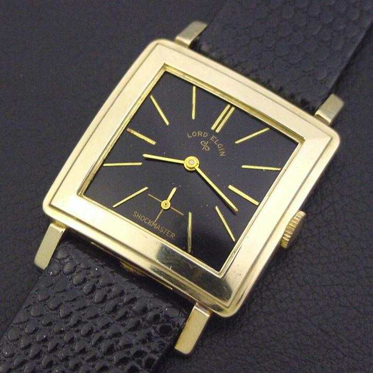 Lord Elgin "Westwood" men's Retro Modern design wristwatch in 14K yellow gold fill, circa 1957.